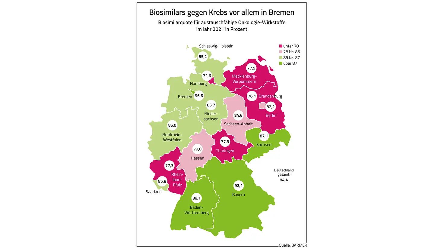 Bei biosimilarfähigen Krebsmedikamenten erstreckte sich die Spanne gemäß der Auswertung von 73 Prozent in Hamburg bis hin zu 92 Prozent in Bayern und 97 Prozent in Bremen. In Mecklenburg-Vorpommern lag die Quote bei knapp 78 Prozent.