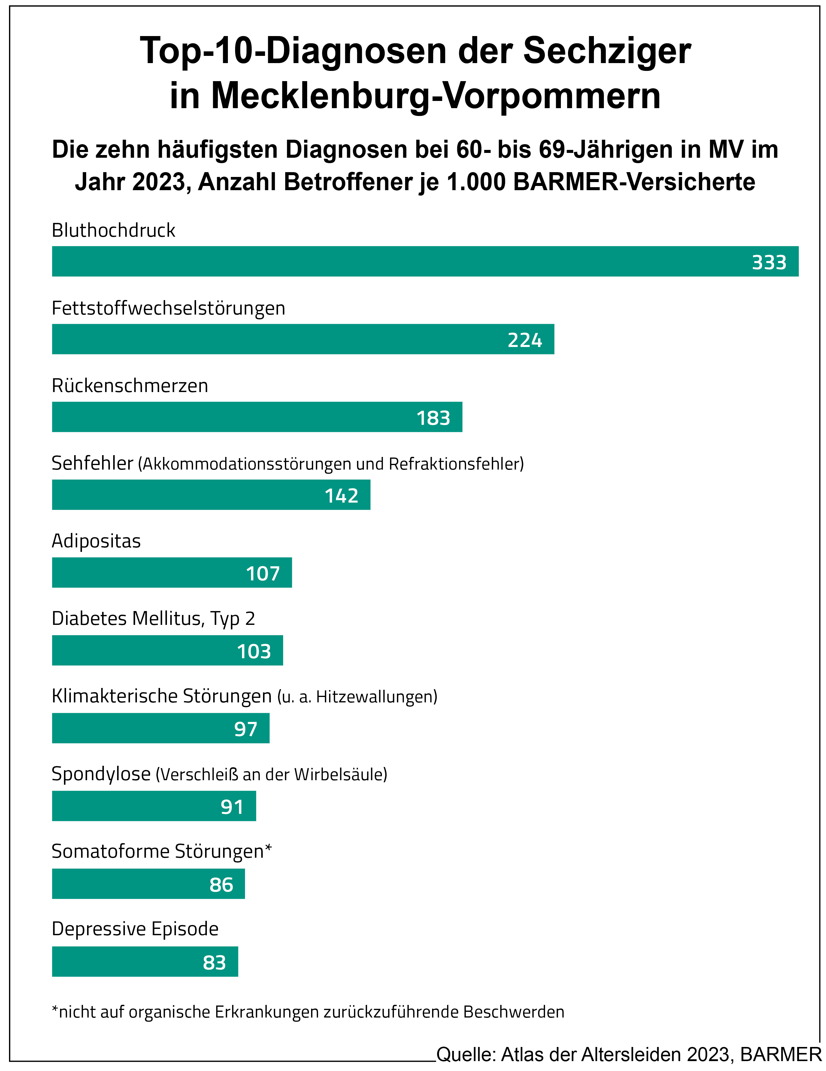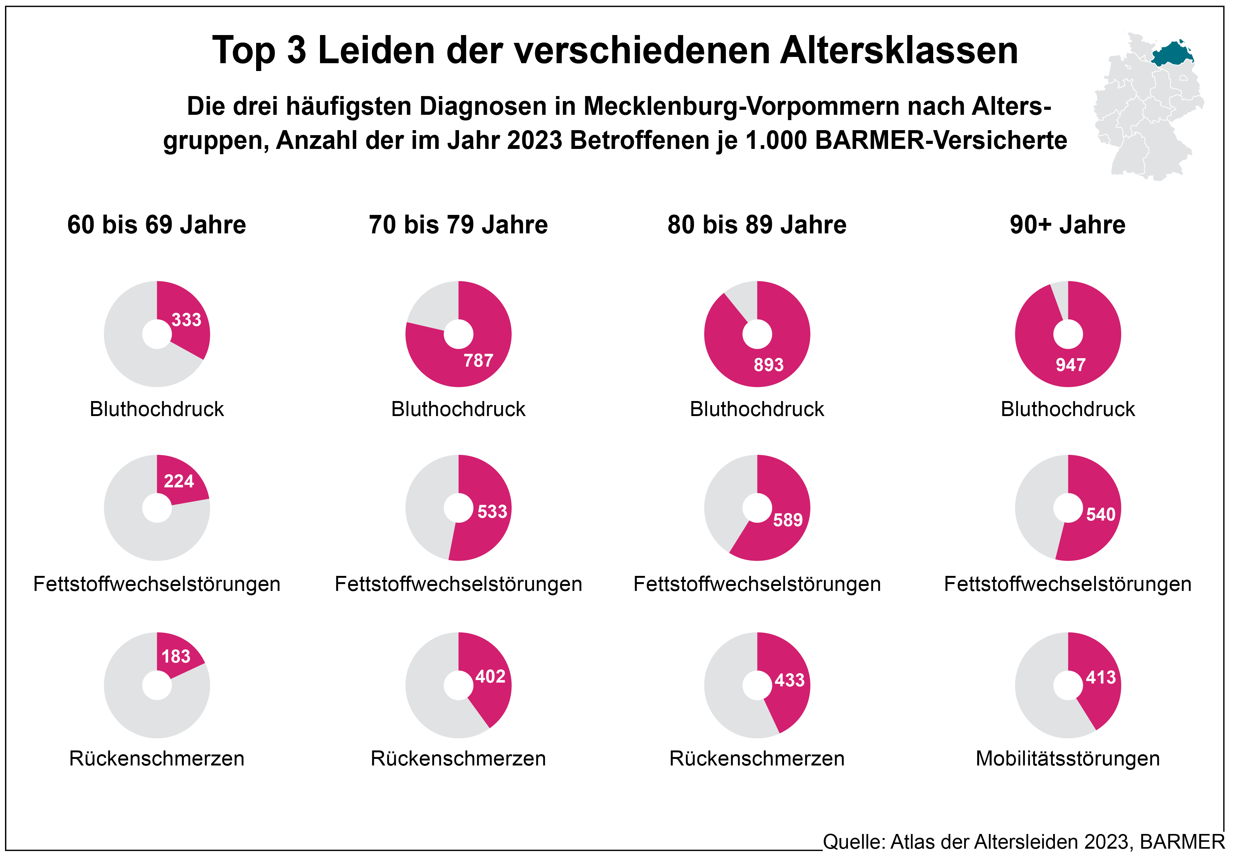 Ab 60 Jahre leiden Menschen in Mecklenburg-Vorpommern vor allem an Bluthochdruck, erhöhtem Cholesterin, Rückenschmerzen, Sehschwäche und Adipositas. Das geht aus dem Altersleiden-Atlas der BARMER hervor, für den ambulante und stationäre Abrechnungsdaten aus dem Jahr 2023 ausgewertet wurden. Darin werden für vier Altersklassen ab 60 Jahren die zehn häufigsten Erkrankungen unter BARMER-Versicherten ausgewiesen. So liegt beispielsweise bei den 60- bis 69-Jährigen in Mecklenburg-Vorpommern Bluthochdruck auf Platz eins im Ranking der Erkrankungen. In dieser Altersgruppe ist ein Drittel (33,3 Prozent) davon betroffen. Dem folgen Fettstoffwechselstörungen wie ein zu hoher Cholesterinwert, worunter knapp ein Viertel (22,4 Prozent) leidet. Auf Platz drei liegen Rückenschmerzen, die bei 18,3 Prozent der 60- bis 69-Jährigen diagnostiziert wurden. Der Atlas zeigt zudem, dass die Häufigkeit einzelner Krankheiten mit dem Alter verstärkt ansteigt. Deutlich wird das am Beispiel Bluthochdruck: Demnach litten bei den 70- bis 79-Jährigen sowie den 80- bis 89-Jährigen im Land bereits 78,7 beziehungsweise 89,3 Prozent darunter.