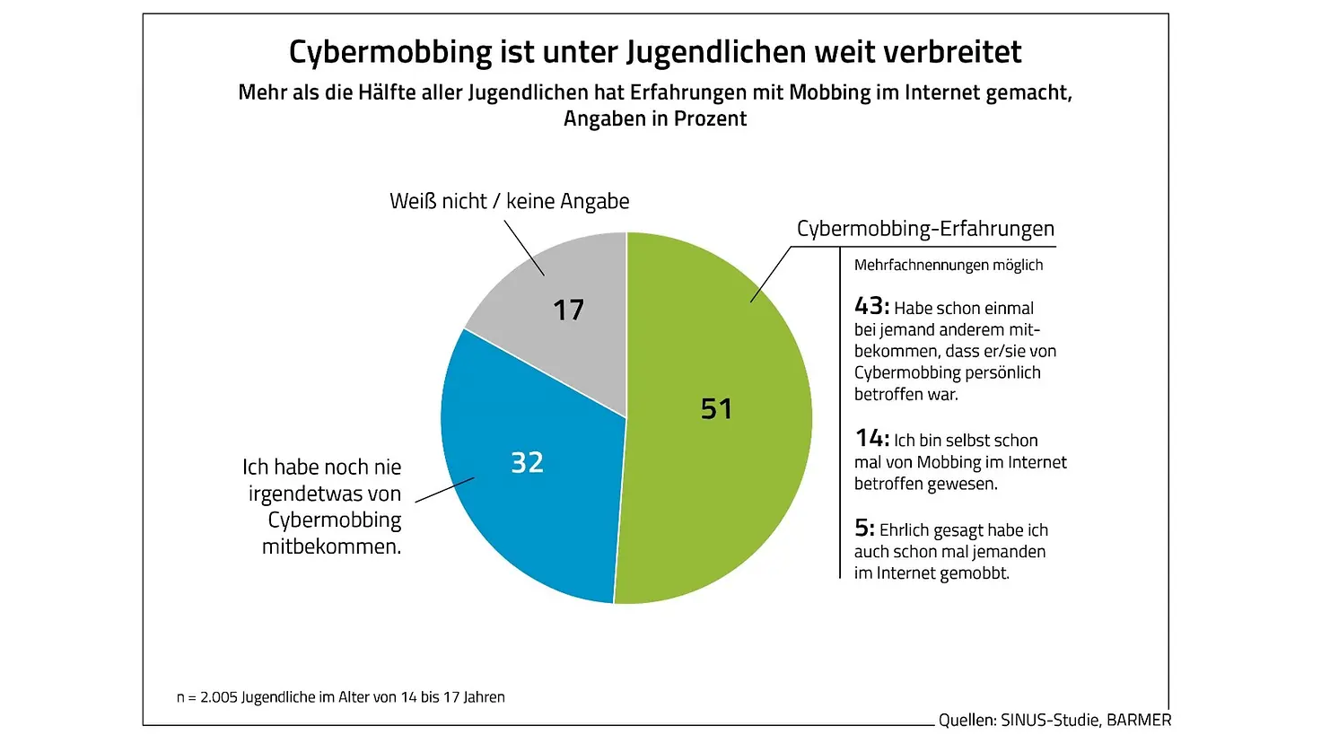 - Cybermobbing ist im Jugendalltag weit verbreitet: Ob als Täter, Opfer oder Beobachter haben über die Hälfte (51 Prozent) der Jugendlichen aus Mecklenburg-Vorpommern Erfahrungen mit Cybermobbing gemacht.