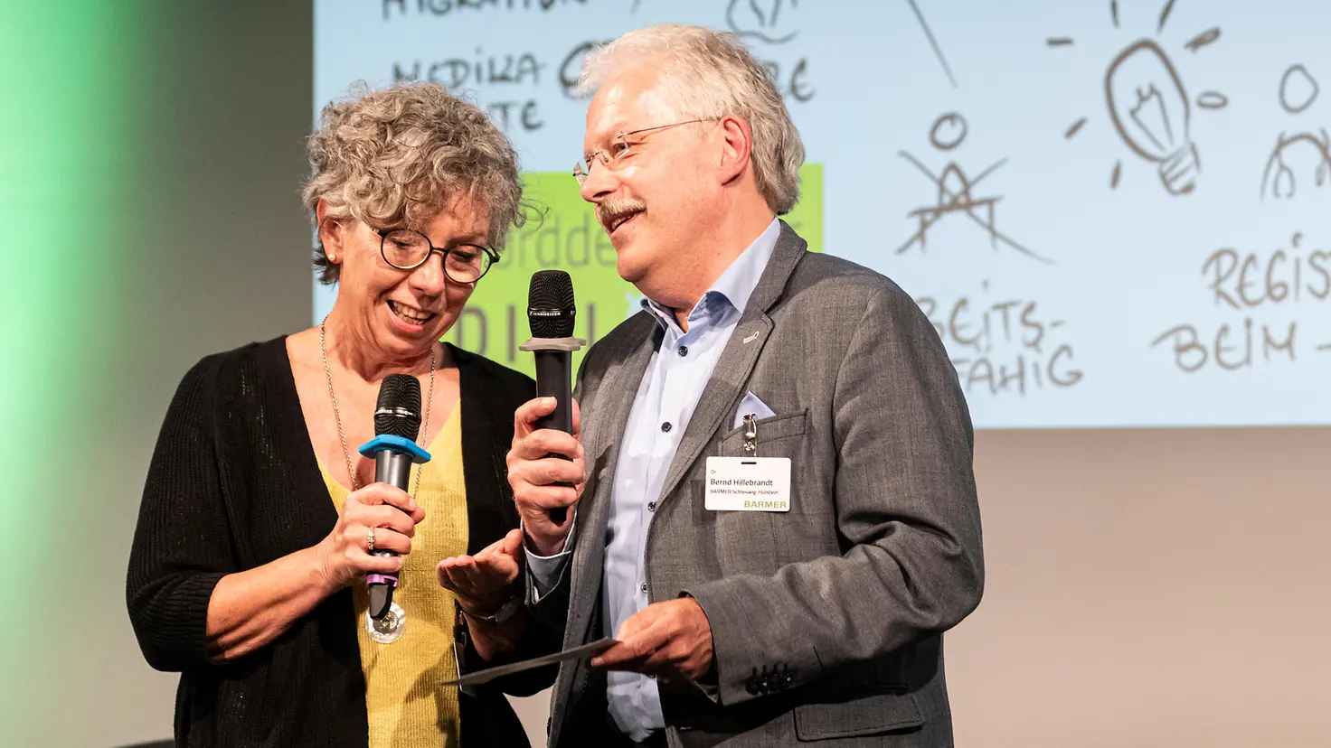 Ob und inwieweit Digitalisierung für mehr Nachhaltigkeit im Gesundheitswesen sorgen könnte, diskutierten in einer zweiten Podiumsrunde Dr. Susanne Klein, BARMER-Landesgeschäftsführerin in Hamburg, und Dr. Fabian Holbe, Hausarzt in Mecklenburg-Vorpommern. Als Arzt im ländlichen Raum äußerte sich Dr. Holbe kritisch, denn nach wie vor gäbe es „tiefe Löcher in der digitalen Infrastruktur“. Setze man vermehrt auf digitale Angebote der Gesundheitsversorgung, würden diejenigen Patientinnen und Patienten ausgegrenzt, „die einen besonderen medizinischen Bedarf haben, nämlich die Alten, Kranken und Schwachen", so Holbe.