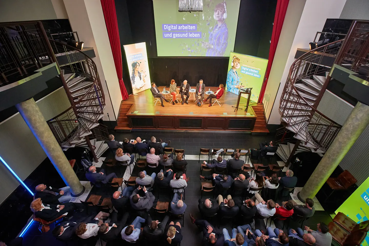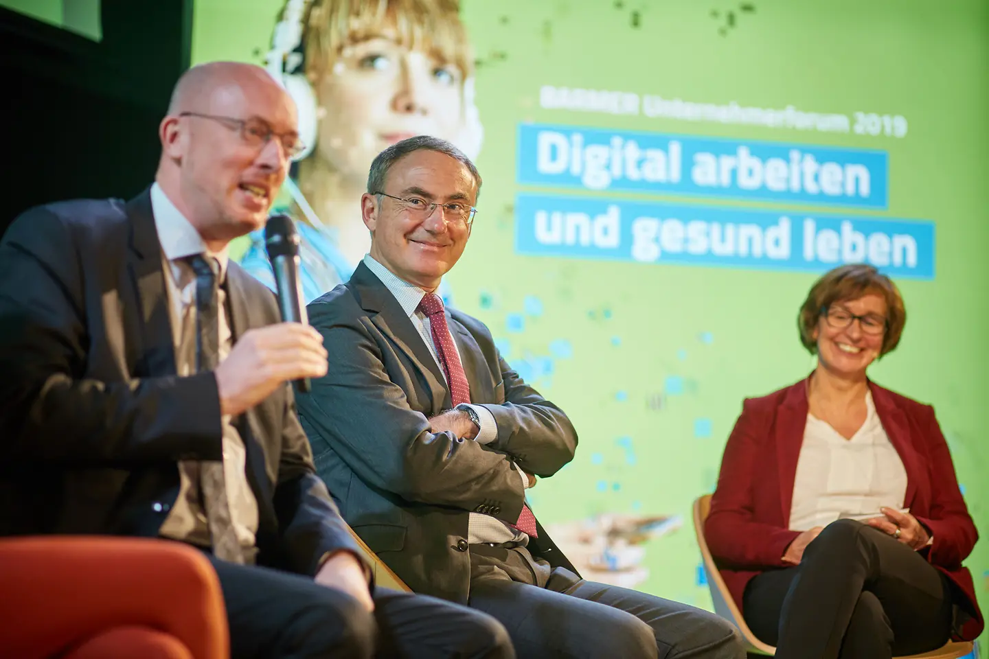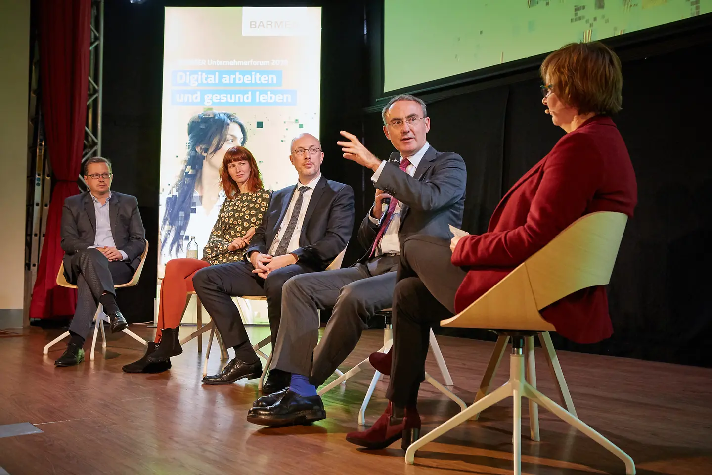 „Unsere Studie zeigt, dass eine ausgewogene Balance zwischen Arbeit und Privatleben im Zuge der Digitalisierung immer wichtiger wird. Wer hier eine klare Linie zieht, ist weniger anfällig für Konflikte und seltener emotional erschöpft“, stellte Prof. Dr. Christoph Straub, Vorstandsvorsitzender der Barmer auf dem Podium heraus. Im Auftrag der Barmer hat die Universität St. Gallen für die Studie rund 8.000 Beschäftigte befragt, die auf der Arbeit digitale Technologien nutzen. Auch bei der Barmer sei die Digitalisierung fest integriert, sagte Prof. Straub. So arbeite die Krankenkasse bei vielen Prozessen bereits papierlos. Für das Wohlbefinden der Mitarbeiter werden aktuelle flexible Arbeitsmodelle getestet.