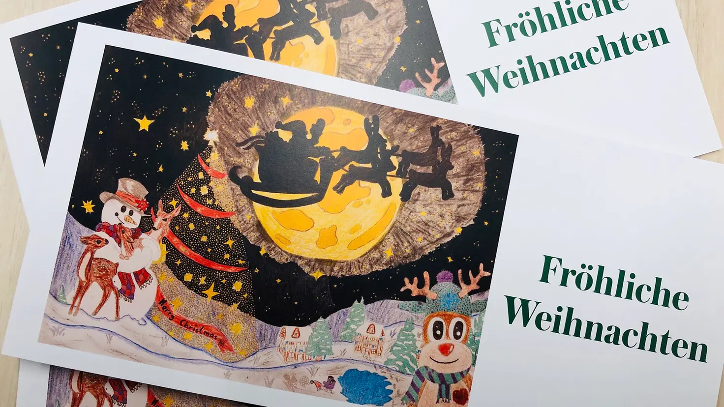 Der Weihnachtsmann mit seinen Rentieren, ein Schneemann sowie ein Elch mit Pudelmütze – und über allem ein riesiger Vollmond, der die winterliche Szene in ein geheimnisvolles Licht taucht. Mit diesem Motiv hat Lucie Marie Unger aus Schwerin bei der Weihnachtskartenmalaktion der Barmer Landesvertretung und des JugendKreativZentrums JAMpoint begeistert.