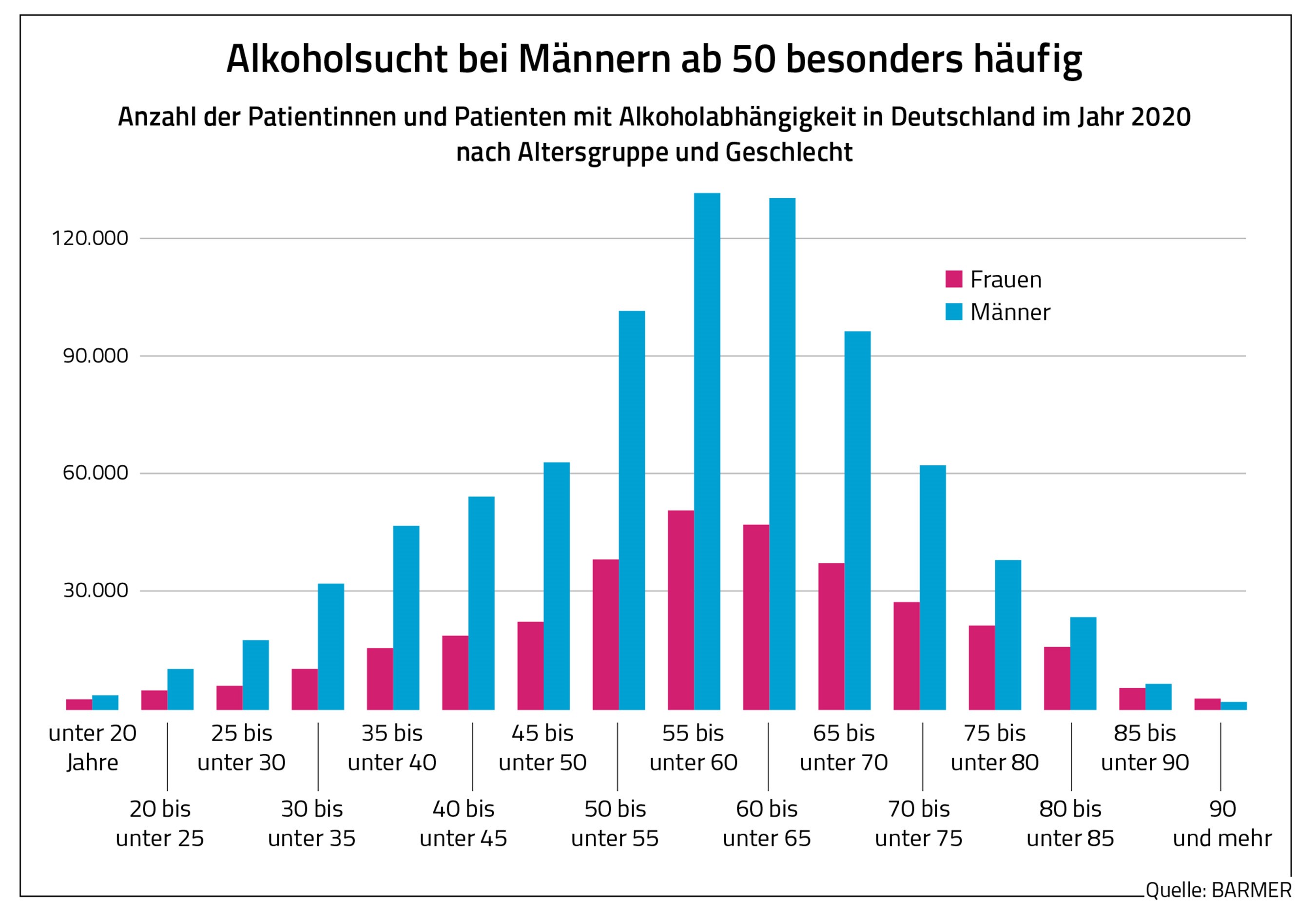 Wie aus der Barmer-Auswertung weiter hervorgeht, waren 2020 in NRW rund 150.200 Männer und etwa 69.500 Frauen laut ärztlicher Diagnose alkoholabhängig. Betroffen waren vor allem Menschen ab dem 50. Lebensjahr. In der Altersgruppe der 60- bis 65-Jährigen finden sich die meisten Betroffenen. Auch hier überwiegt die Zahl der Männer mit rund 24.600 deutlich gegenüber der Zahl der Frauen mit etwa 9.700. „Alkoholismus manifestiert sich in der Regel über viele Jahre und kommt vor allem in der Generation der Babyboomer der 50er- und 60er-Jahre vor“, sagt Heiner Beckmann, Landesgeschäftsführer der Barmer in NRW. Neben individuellen Gründen spiele auch die Sozialisation eine Rolle. In früheren Jahrzehnten sei ein wesentlich sorgloserer Umgang mit Alkohol üblich gewesen, während heute viel stärker über die gesundheitlichen Risiken aufgeklärt werde. Ein maßvoller und risikobewusster Umgang mit Alkohol könne helfen, einer Abhängigkeit vorzubeugen. Denn diese könne mit ernsten physischen und psychischen Folgeerkrankungen sowie negativen Auswirkungen auf das Sozial- und Berufsleben einhergehen.