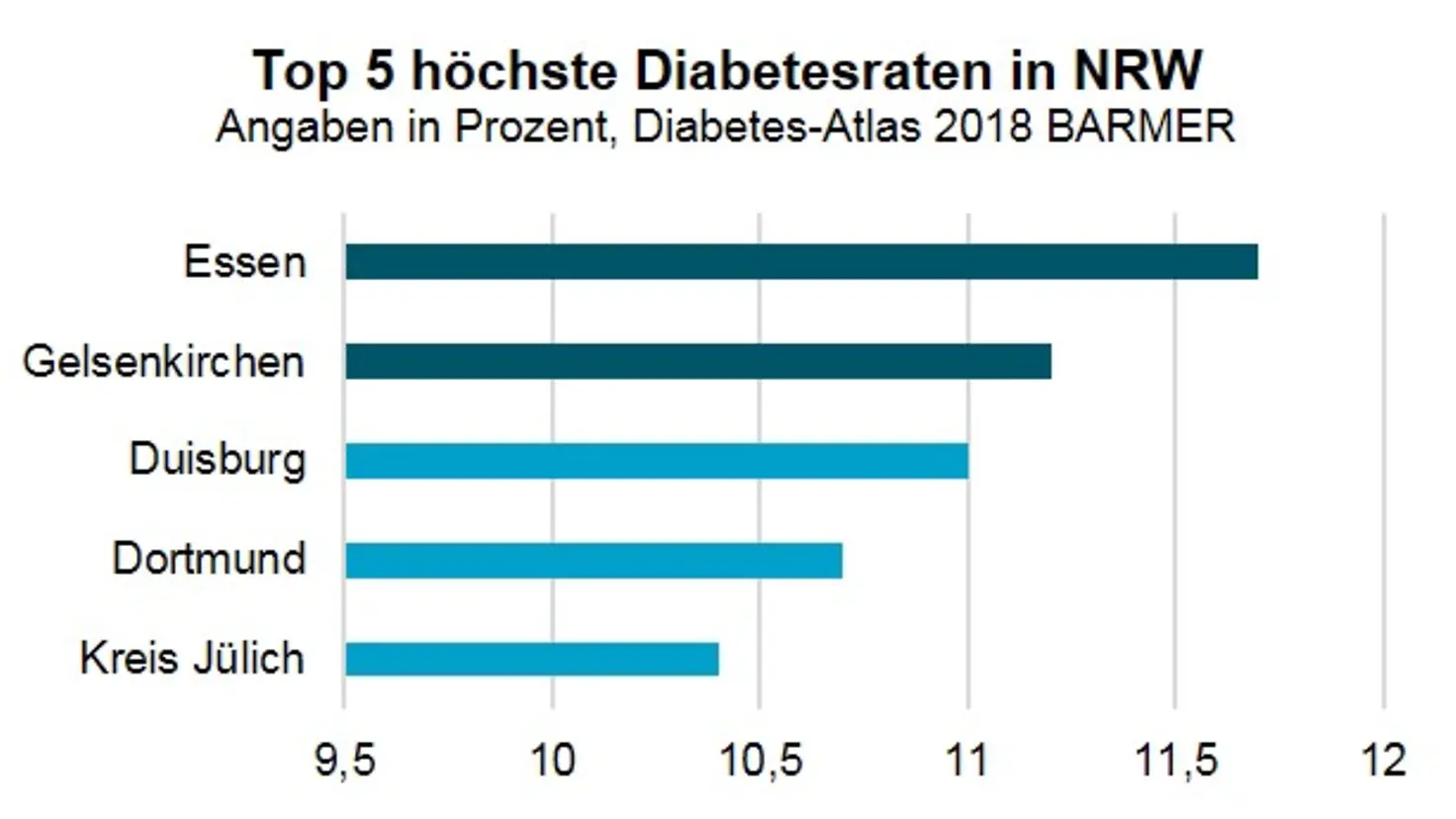 „Die regionalen Schwankungen bei den Diabetesraten sind jedoch nicht auf unterschiedliche Alters- oder Geschlechtsstrukturen zurückführen“, erläutert Beckmann. In den Ruhrgebietsstädten Essen (11,7 Prozent), Gelsenkirchen (11,2 Prozent), Duisburg (11 Prozent) und Dortmund (10,7 Prozent) ist der Anteil an Diabetikern am höchsten. Die fünfthöchste Diabetesrate hat der Kreis Jülich (10,4 Prozent).