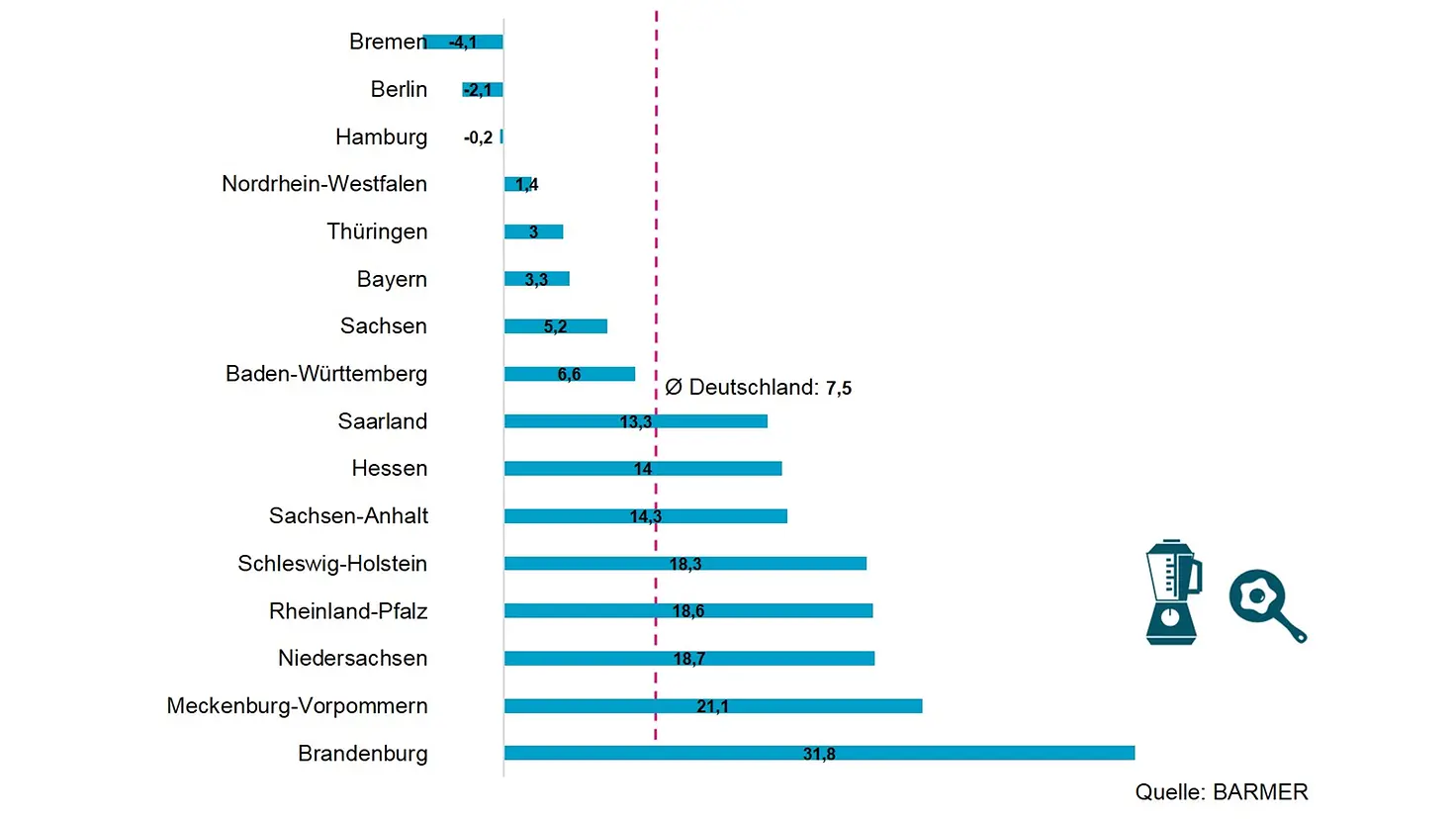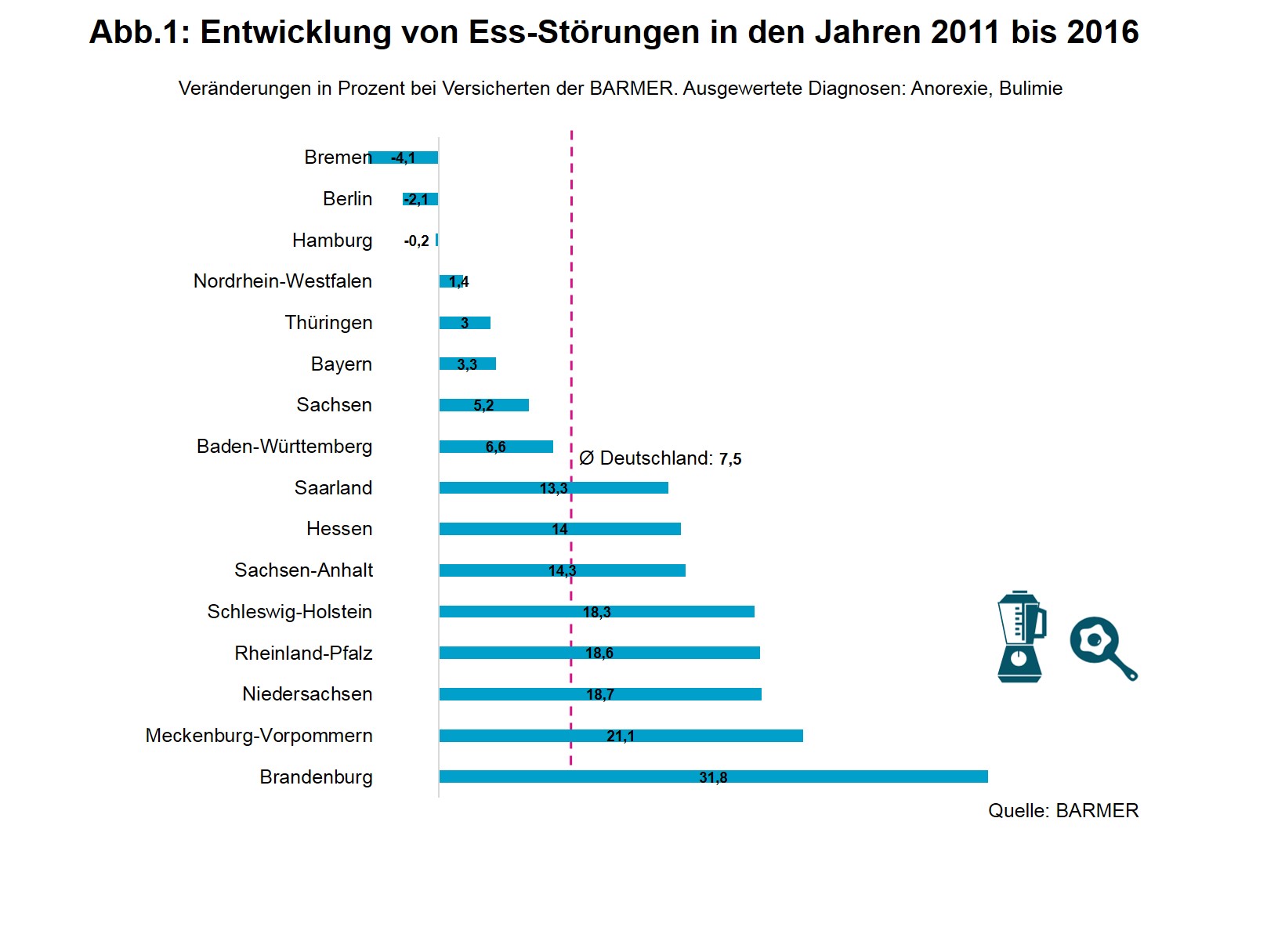 Düsseldorf, 24. April 2018 – Mit Ausnahme der Stadtstaaten Berlin, Bremen und Hamburg sind Ess-Störungen bundesweit auf dem Vormarsch. Nordrhein-Westfalen hat von den Flächenländern den insgesamt niedrigsten Anstieg (Abb.1). Dies belegt eine neue Analyse der Krankenkasse Barmer. Innerhalb von fünf Jahren stieg der Anteil an betroffenen Versicherten in NRW um 1,4 Prozent. „Magersucht und Bulimie sind keine harmlosen Teenager-Krankheiten. Sie betreffen alle Altersgruppen und können schwere Organschäden nach sich ziehen. Schlimmstenfalls enden Ess-Störungen sogar tödlich“, sagt Heiner Beckmann, Landesgeschäftsführer der Barmer.