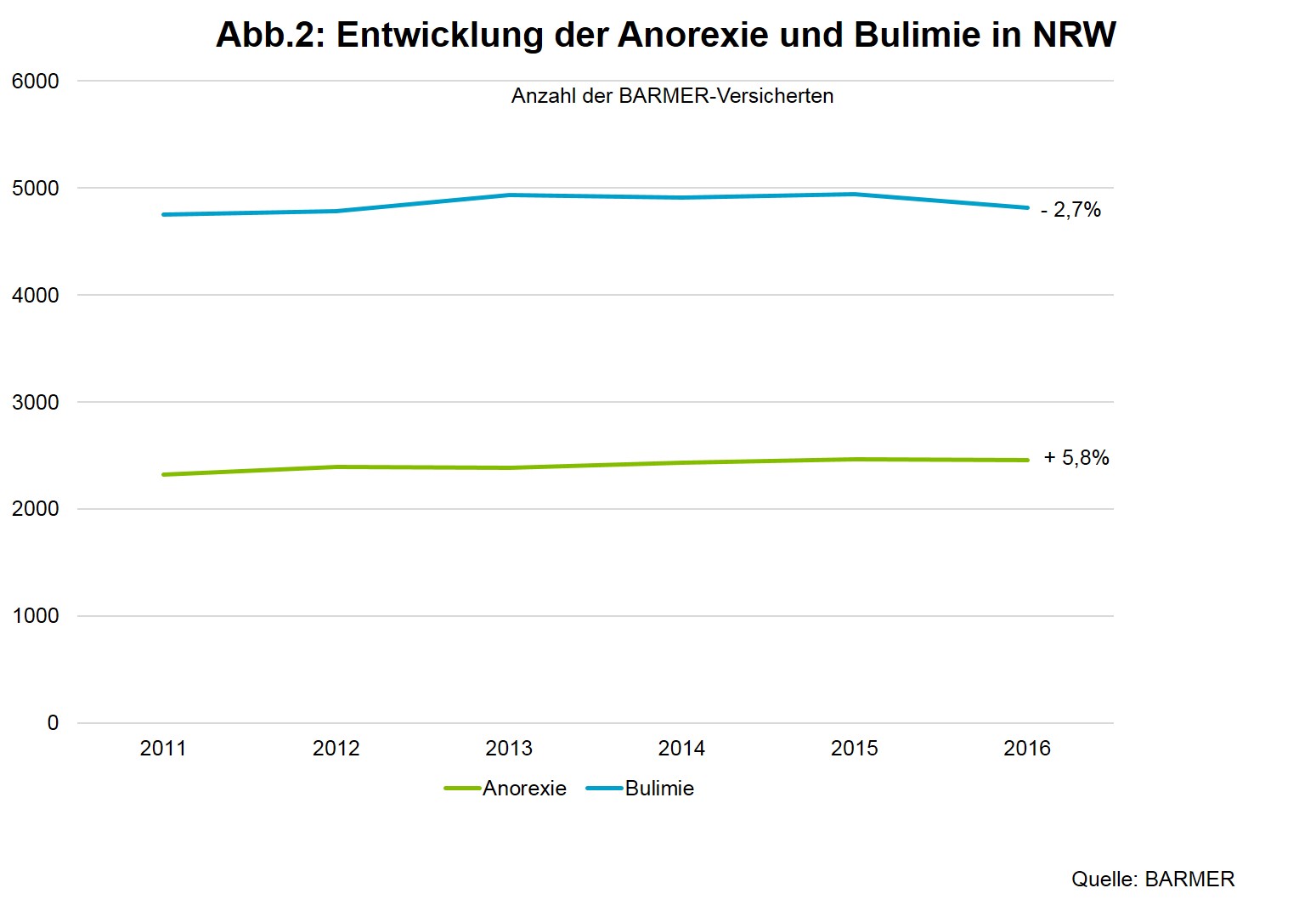 Von Magersucht (Anorexie) waren in NRW in den Jahren 2011 bis 2016 rund 13.700 Frauen allein bei der Barmer betroffen. Bei den männlichen Versicherten gab es ca. 750 Erkrankte. „Die Dunkelziffer dürfte bei Anorexie aber um ein Vielfaches höher liegen“, erklärt Beckmann.