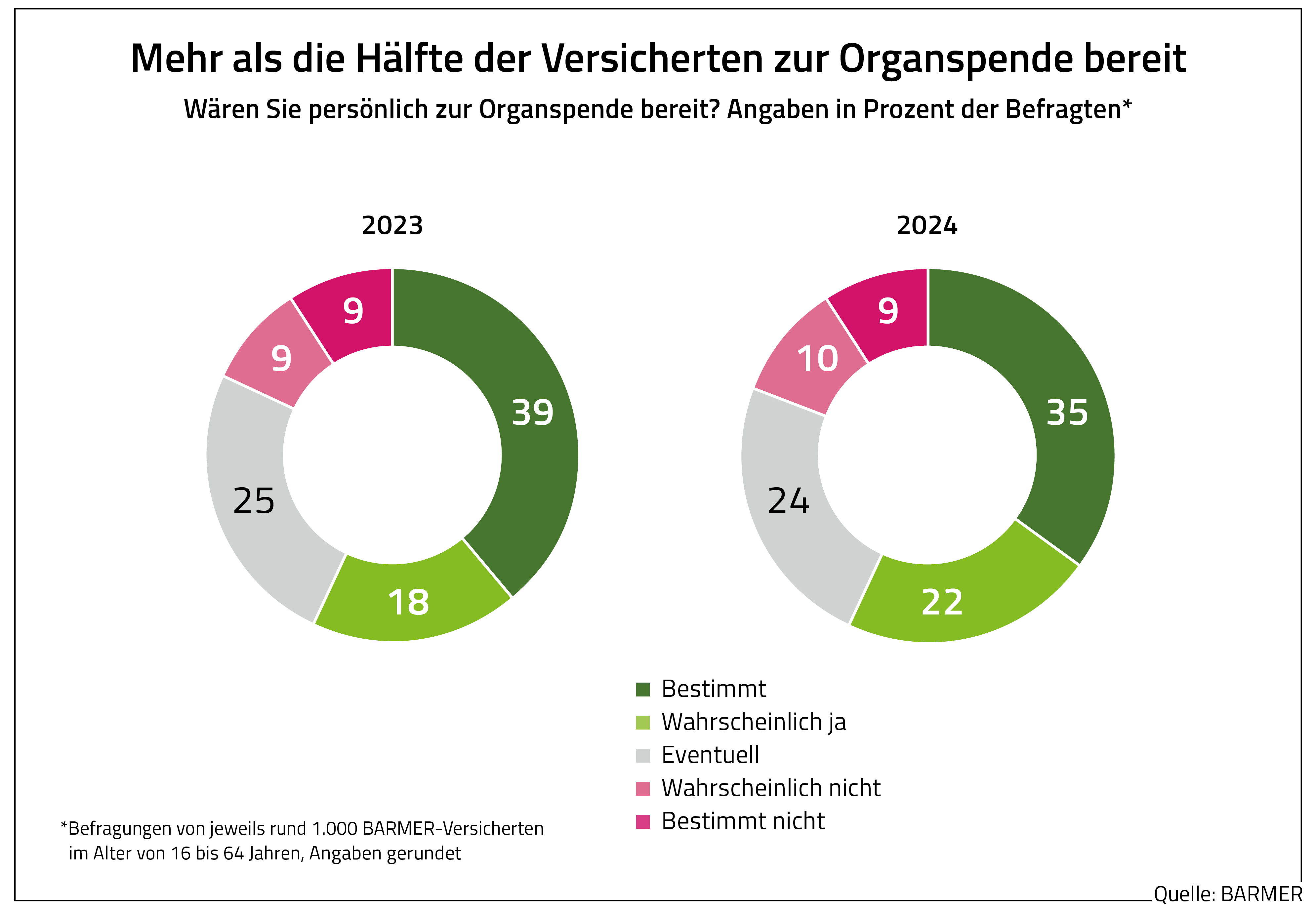 Düsseldorf, 24. Juni 2024 – Mehr als die Hälfte der Barmer-Versicherten ist zur Organspende bereit. Das geht aus einer repräsentativen Umfrage der Krankenkasse unter rund 1.000 Versicherten im Alter von 16 bis 64 Jahren im April und Mai dieses Jahres hervor. Demnach erklärten wie im Vorjahr 57 Prozent der Befragten, dass sie bestimmt oder wahrscheinlich zu einer Organspende bereit wären. Somit ist das Ergebnis konstant im Vergleich zum vergangenen Jahr. Zehn Prozent der Befragten schließen eine Organspende sicher aus. „Organspenden können Leben retten. Patientinnen und Patienten, bei denen lebenswichtige Organe wie Herz, Leber oder Nieren zu versagen drohen, haben häufig keine andere Hoffnung außer einer Transplantation. Ein gespendetes Organ kann diesen Menschen die Chance auf ein neues Leben geben“, sagt João Rodrigues, Landesgeschäftsführer der Barmer. Es bedürfe daher nicht nur von Krankenkassen ausreichend qualifizierter Informationen, damit die Menschen ihre individuelle Entscheidung für oder gegen eine Organspende treffen können.