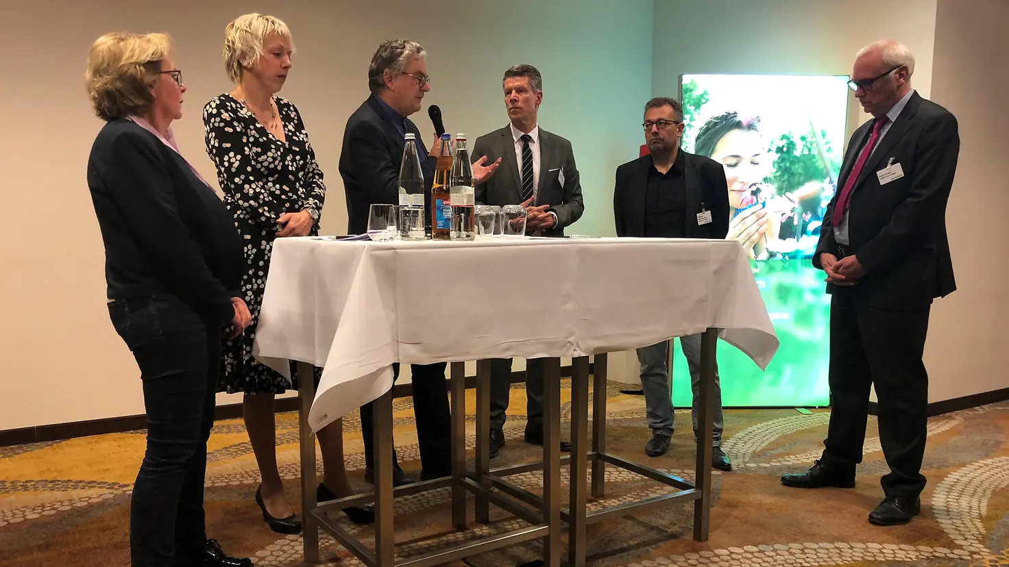 Von links nach rechts: Angela Lück (SPD), Susanne Schneider (FDP), Moderator Jürgen Zurheide, Heiner Beckmann (Barmer), Mehrdad Mostofizadeh (Grüne) und Peter Preuß (CDU) bei der Diskussion in Düsseldorf.