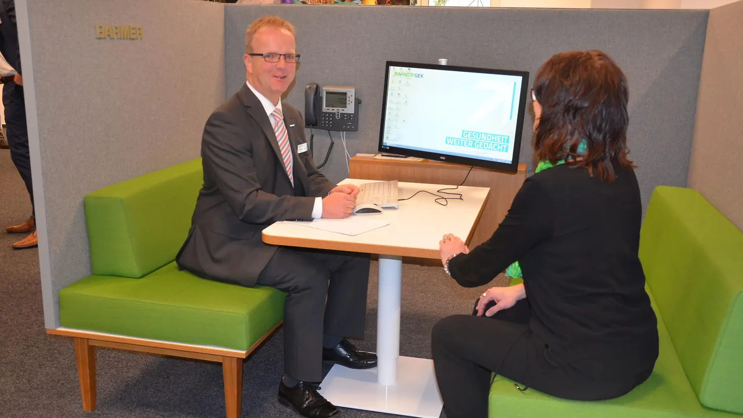 Nach und nach wird das neue Beratungskonzept in den Geschäftsstellen auch anhand des Interieurs sichtbar: Im Eingangsbereich empfangen die Kundenberater jeden Besucher. Schnell zu beantwortende Fragen können sie hier klären. "Wir möchten weg von der Beratung am Schreibtisch hin zum Dialog auf Augenhöhe. Deswegen haben wir für vertrauliche Gespräche neue Beratungsboxen mit Computern", sagt Ralf Uhlenbruch, Leiter des Gebiets Nordwest bei der Krankenkasse. Der gemeinsame Blick auf den Bildschirm schafft Transparenz über alle Vorgänge, schalldämmende Trennwände um die Beratungszonen sorgen für Diskretion.