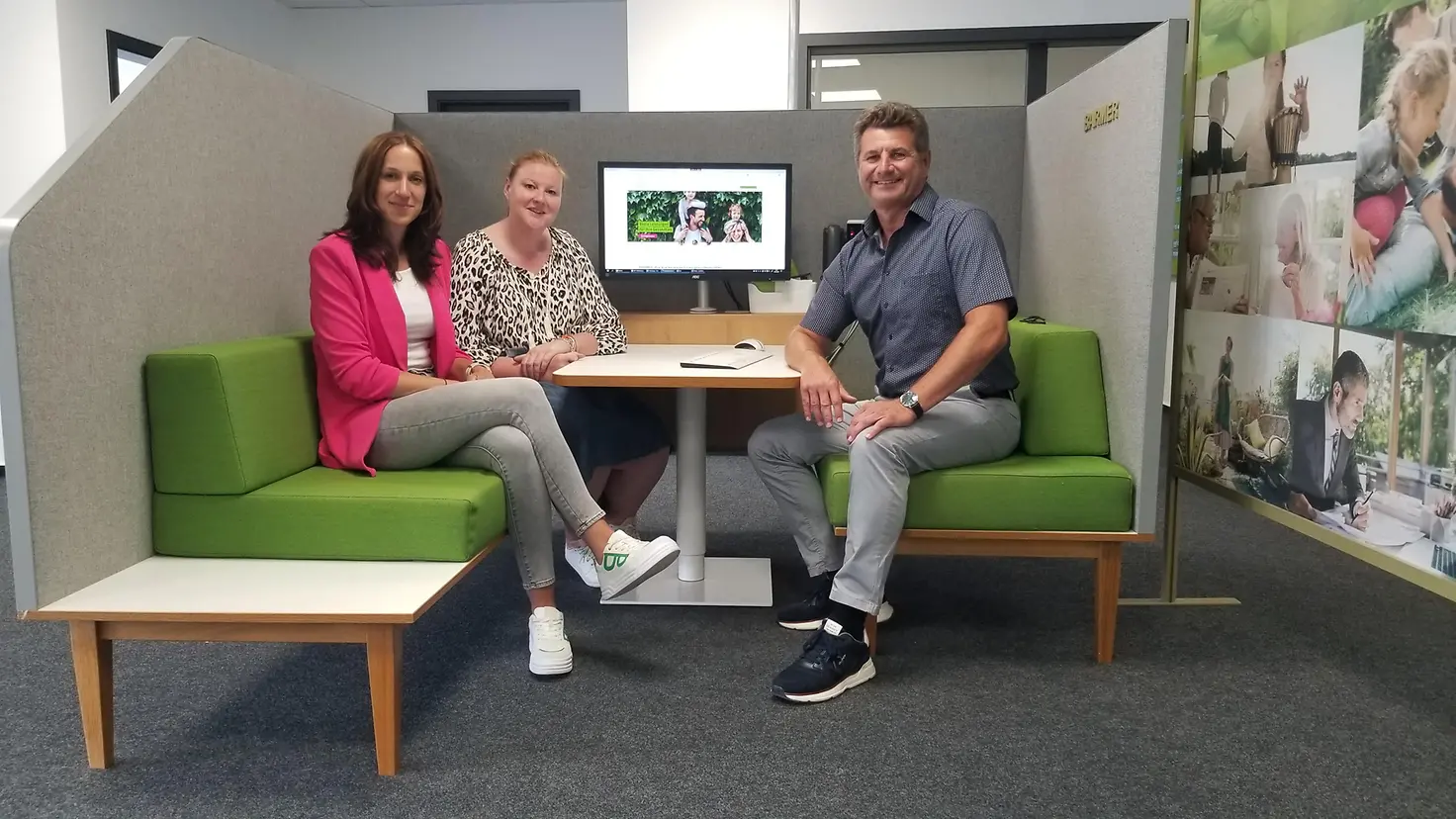 Probesitzen in einer Beratungsbox der neuen Barmer-Geschäftsstelle in Bad Kreuznach: Barmer-Regionalgeschäftsführer Markus Brunk mit den Geschäftsstellen-Mitarbeiterinnen Stefanie Andres (l.) und Simone Hey. Foto: Barmer/Oliver Weick