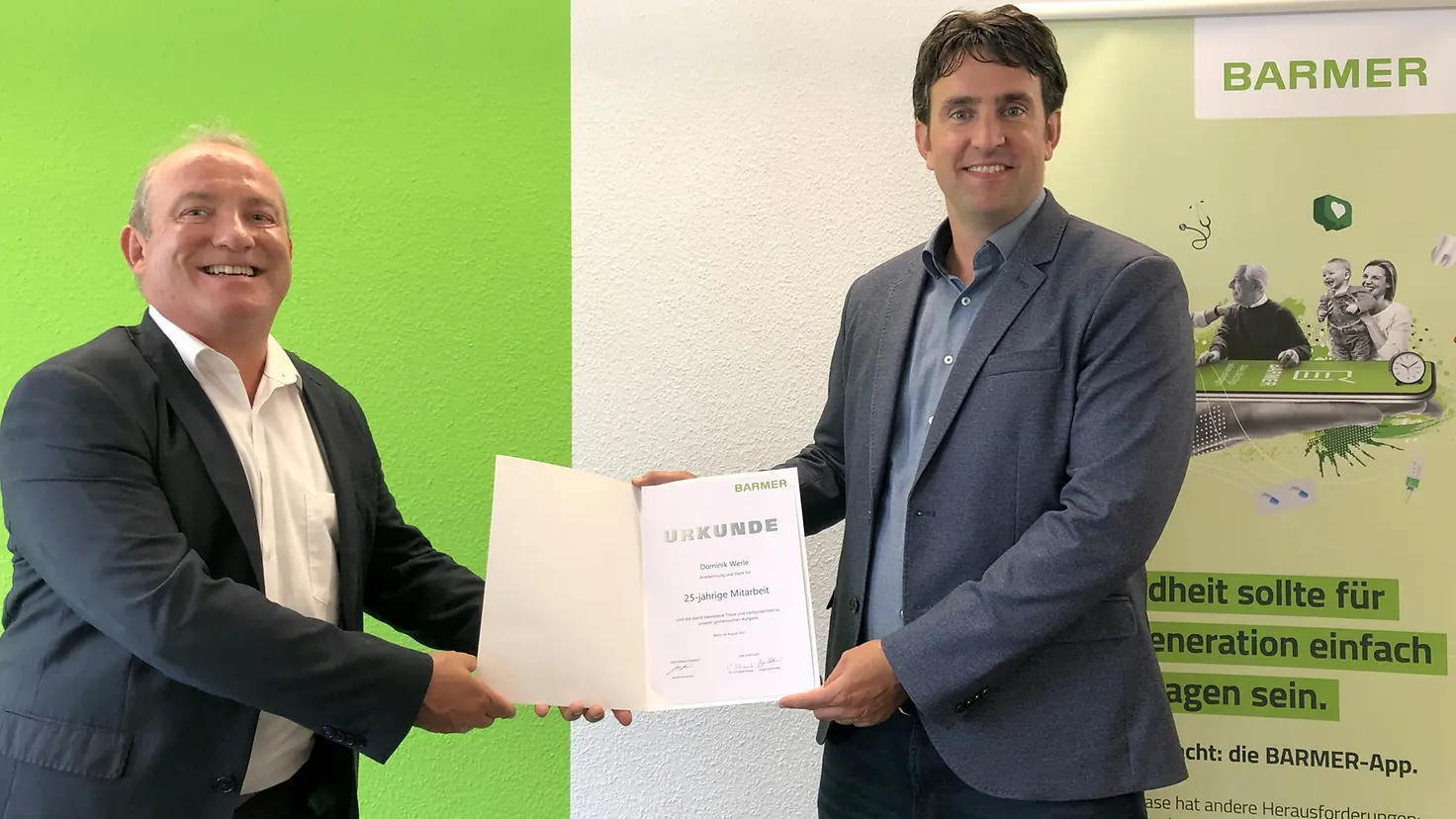 Barmer-Hauptgeschäftsführer Guido Ernst (links) übergibt Barmer-Regionalgeschäftsführer Dominik Werle eine Urkunde für die 25-jährige Betriebszugehörigkeit. Foto: Barmer/S. Tessling