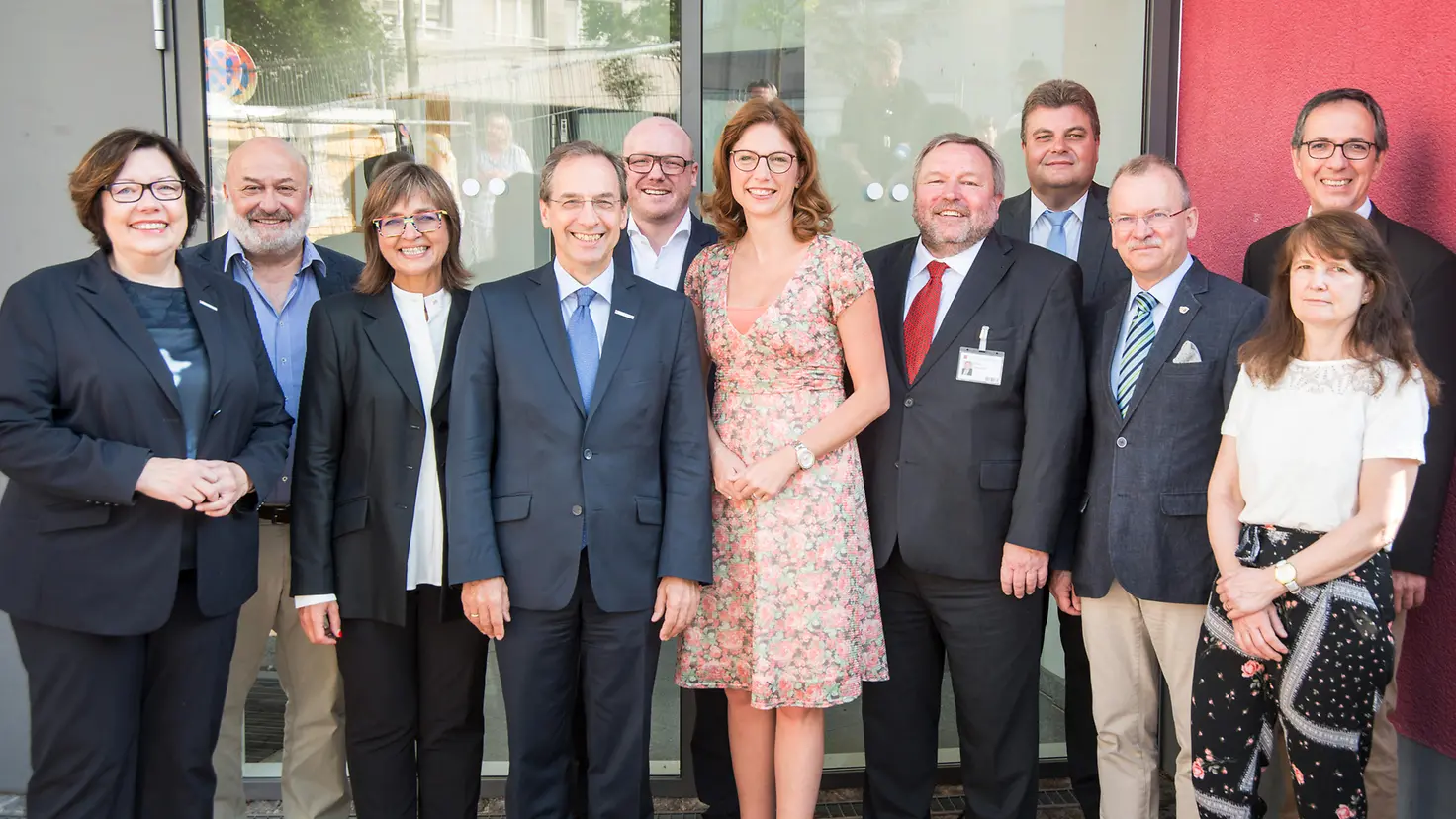 Heute startete das Projekt GerNe offiziell im Beisein der Projektbeteiligten, der rheinland-pfälzischen Gesundheitsministerin Sabine Bätzing-Lichtenthäler (6.v.l.), Barmer Landesgeschäftsführerin Dunja Kleis (3.v.l.), dem Vorstandsvorsitzenden und Medizinischen Vorstand der Universitätsmedizin Mainz, Univ.-Prof. Dr. Norbert Pfeiffer (4.v.l.-Vierter von links), und Konsortialführer des GerNe-Projekts, Prof. Dr. Roland Hardt (7.v.l.). Bildquelle: Markus Schmidt (Universitätsmedizin Mainz)