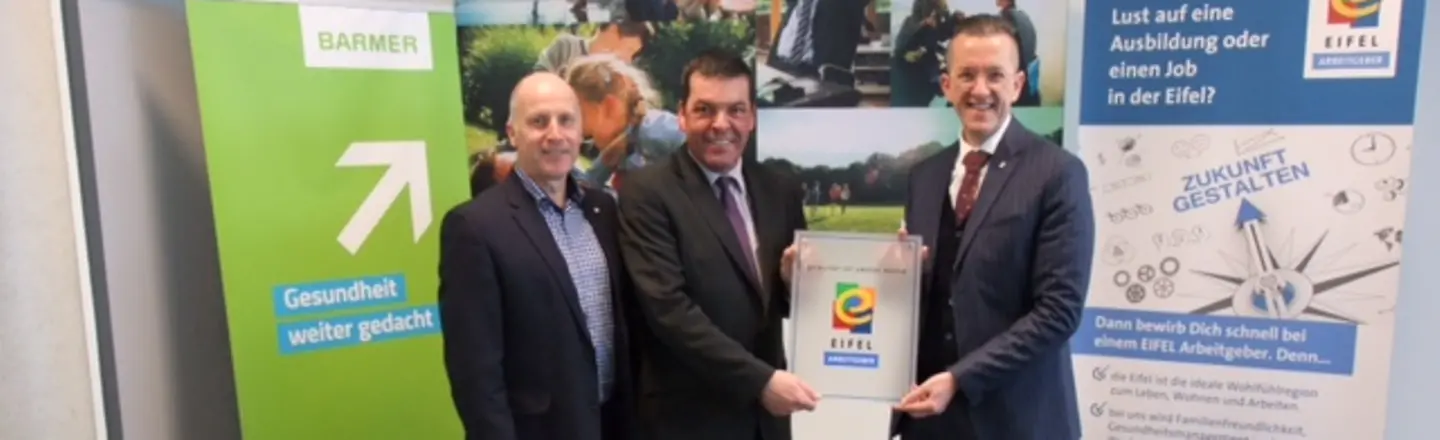 Bitburg/Prüm, 23. Januar 2019 – Die Barmer Regionalgeschäftsstelle in Bitburg ist der Arbeitgebermarke EIFELbeigetreten. „Das Jahr 2019 startet, wie das vergangene Jahr endete, nämlich mit attraktiven Zuwächsen für das Qualitätsnetzwerk der Arbeitgebermarke EIFEL. Die Zeichen stehen weiter auf Wachstum“, sagte Markus Pfeifer, Geschäftsführer der Regionalmarke EIFEL, bei Übergabe der Mitgliedsplakette an Frank Schlöder, Regionalgeschäftsführer der Barmer in Bitburg, im Beisein von Dr. Joachim Streit, Landrat des Eifelkreises Bitburg-Prüm. Dem Netzwerk gehören nun insgesamt 32 Unternehmen an.