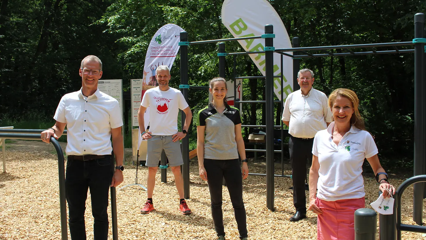 Cochem, 18. Juni 2021 – Neue Möglichkeiten sich fit zu halten, bietet die Conder Höhe in Cochem. Dort eröffneten Barmer-Regionalgeschäftsführer Roland Geisbüsch und Michaela Ruffing, Projektleiterin für Fitness-Locations beim Deutschen Turner-Bund (DTB), einen Fitness-HotSpot. An ihm laden verschiedene Geräte ein, sich körperlich zu betätigen. Cochem ist einer von 14 Orten in Deutschland und der einzige in Rheinland-Pfalz, an denen die Barmer und der DTB ein solches Bewegungsangebot geschaffen haben. „Der Fitness-HotSpot bietet gute Trainingsbedingungen für alle, die zeitlich flexibel Sport treiben möchten. Auch Schulklassen können ihn zum Beispiel fürs Zirkeltraining nutzen“, sagte Geisbüsch.