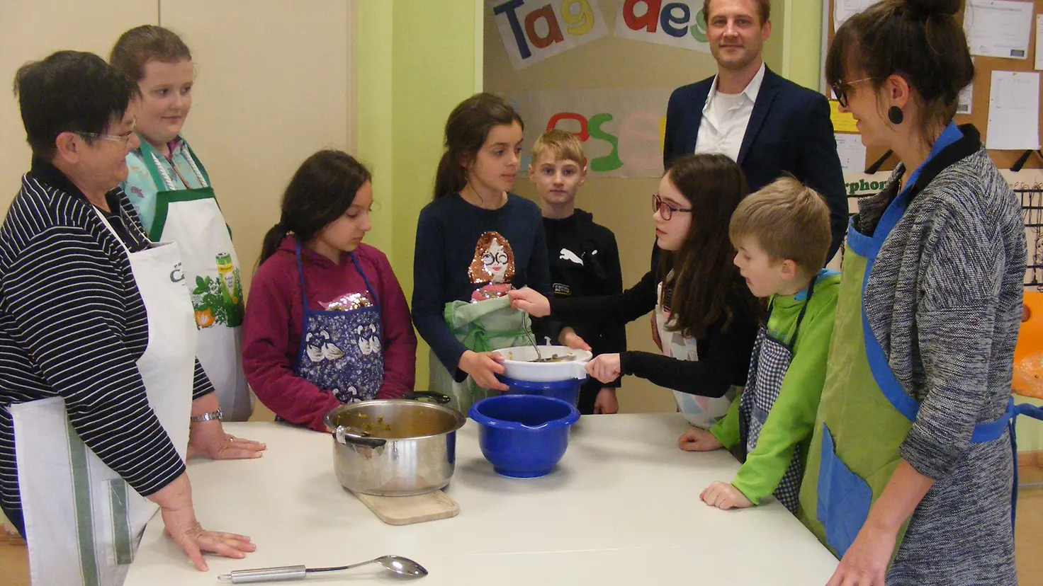 Zudem gebe es an der Schule die Arbeitsgruppe (AG) „Leckere Lebensmittel“. „In der Gruppe werden saisonale Lebensmittel aus dem Schulgarten oder von den benachbarten Bauernhöfen entweder in der Schule oder in Kooperation mit einem örtlichen Caterer in dessen Profiküche gekocht“, berichtete Schabio. Bei der geförderten Kochaktion stand die Zubereitung einer Kartoffelsuppe auf dem Speiseplan.
