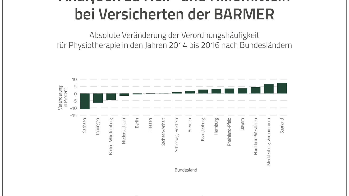 Laut Heil- und Hilfsmittelreport haben Barmer Versicherte im Saarland im Jahr 2016 exakt 57.246 Verordnungen für physiotherapeutische Behandlungen erhalten. Das entspricht einer Zunahme von 7,5 Prozent im Vergleich zum Jahr 2014 (53.274 Verordnungen). Rheinland-Pfalz verzeichnet im gleichen Zeitraum einen Anstieg von 3,5 Prozent. Kleis sagt: „Erstaunlich ist, dass die Zahl der verordneten Physiotherapien im Auswertungszeitraum in fünf Bundesländern rückläufig waren.“ Heilmittel seien ein wichtiger Teil der medizinischen Versorgung, die oft einen unschätzbaren Beitrag zur Verbesserung des körperlichen oder geistigen Zustands leisten würden.