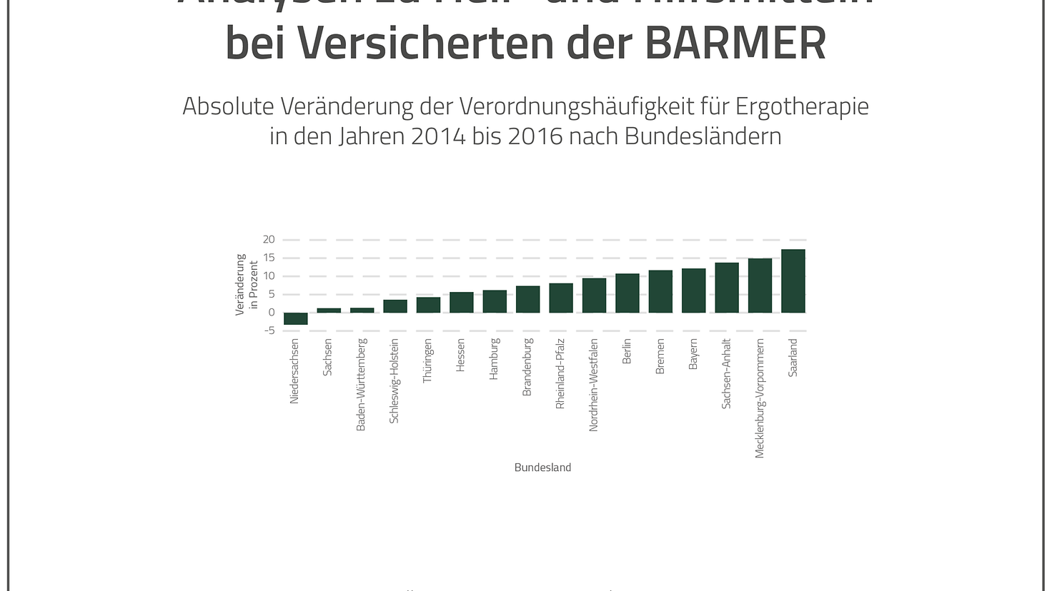 Ergotherapie hilft Menschen, eine durch Krankheit, Verletzung oder Behinderung verlorengegangene Handlungsfähigkeit zu erreichen zum Beispiel nach einem Schlaganfall oder bei Kindern aufgrund von Entwicklungsstörungen. Im Saarland gab es in den Jahren 2014 bis 2016 einen Anstieg der Verordnungen für Ergotherapien um 17,5 Prozent auf 4.944. Das Bundesland ist damit Spitzenreiter im Ländervergleich vor Mecklenburg-Vorpommern (14,9 Prozent). „In Niedersachsen hat im gleichen Zeitraum die Zahl der verordneten Ergotherapien sogar abgenommen“, berichtet Kleis.