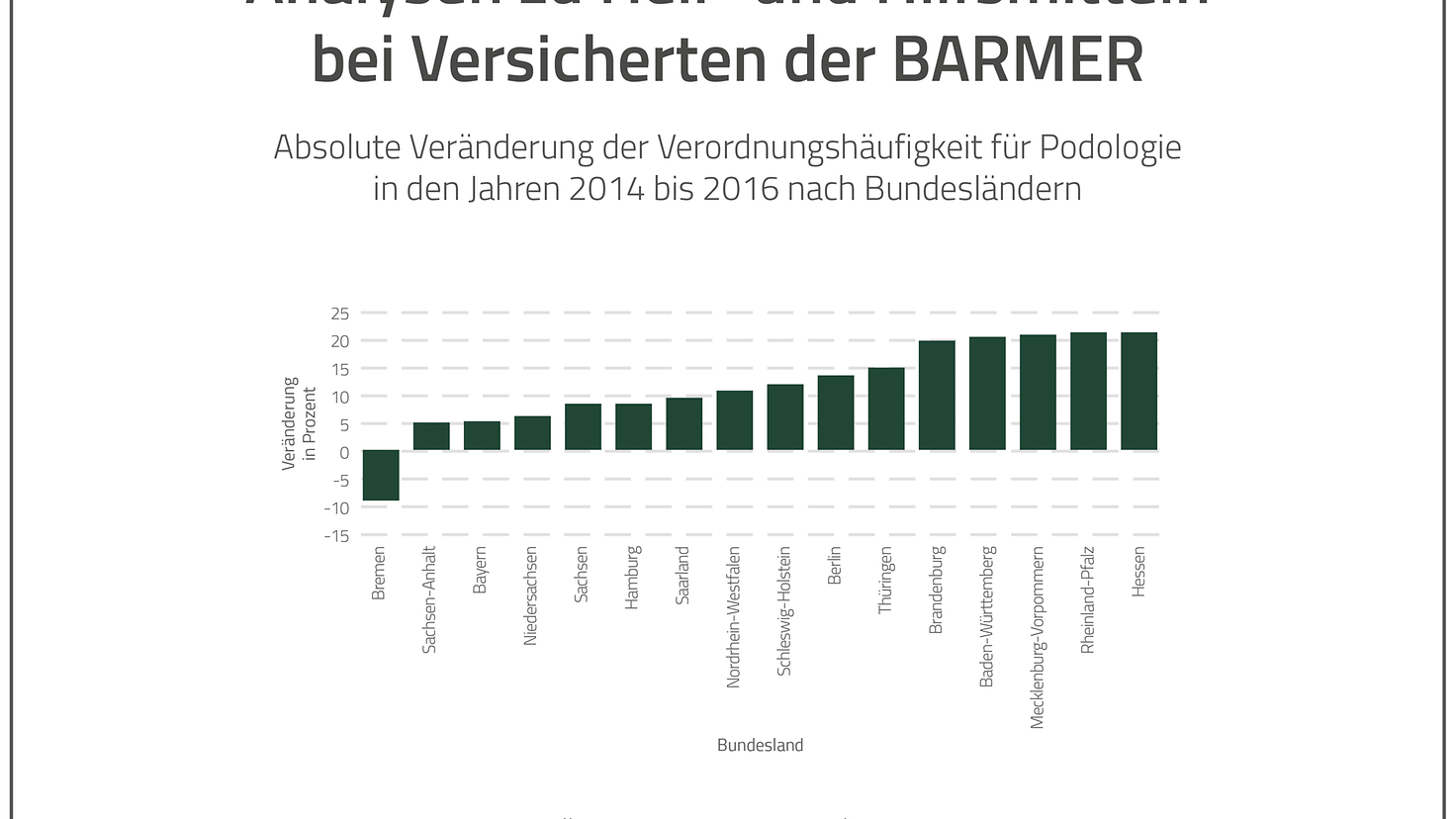 Genau 8.095 Verordnungen für podologische Behandlungen haben Barmer Versicherte in Rheinland-Pfalz im Jahr 2016 erhalten. Das entspricht einer Zunahme von 21,5 Prozent im Vergleich zum Jahr 2014 (6.663 Verordnungen). „In Bremen ging im gleichen Zeitraum die Zahl der verordneten podologischen Therapien um rund zehn Prozent zurück“, berichtet Kleis.