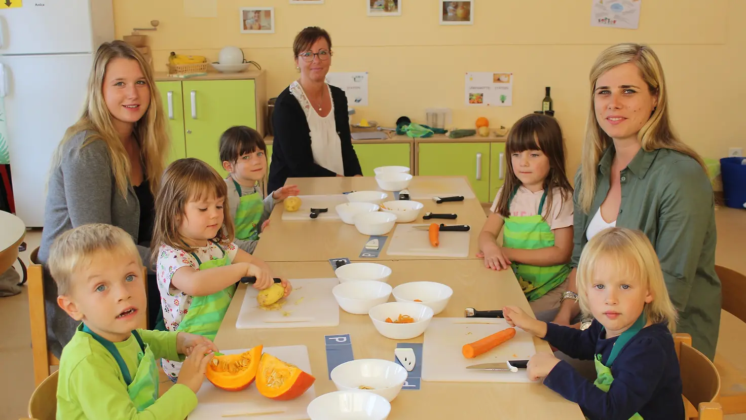 Die Erzieherin und Genussbotschafterin Bauer sagte: „Bei der Genussbotschafterschulung von Ich kann kochen! habe ich viele nützliche Tipps und wertvolle Information zum Kochen mit Kindern erhalten.“ Wichtig sei, Kindern die Möglichkeit zu geben, Lebensmittel mit allen Sinnen zu begreifen. An der Kita sei auch schon vorher auf gesunde und ausgewogene Ernährung geachtet worden. Bei der kindgerechten Kochaktion in der Kitaküche stand die Zubereitung eine Kürbissuppe auf dem Speiseplan. Insgesamt zehn Kochaktionen und ein tägliches Frühstücksbuffet werden durch die Förderung unterstützt.