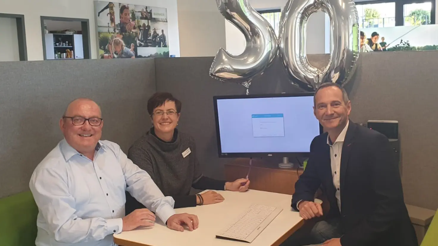 Barmer-Hauptgeschäftsführer Guido Ernst (l.), Barmer-Mitarbeiterin Jeanette Seibüchler und Regionalgeschäftsführer Ulrich Jene freuen sich über das 50-jährige Bestehen der Barmer-Geschäftsstelle in Illingen. Foto: Barmer
