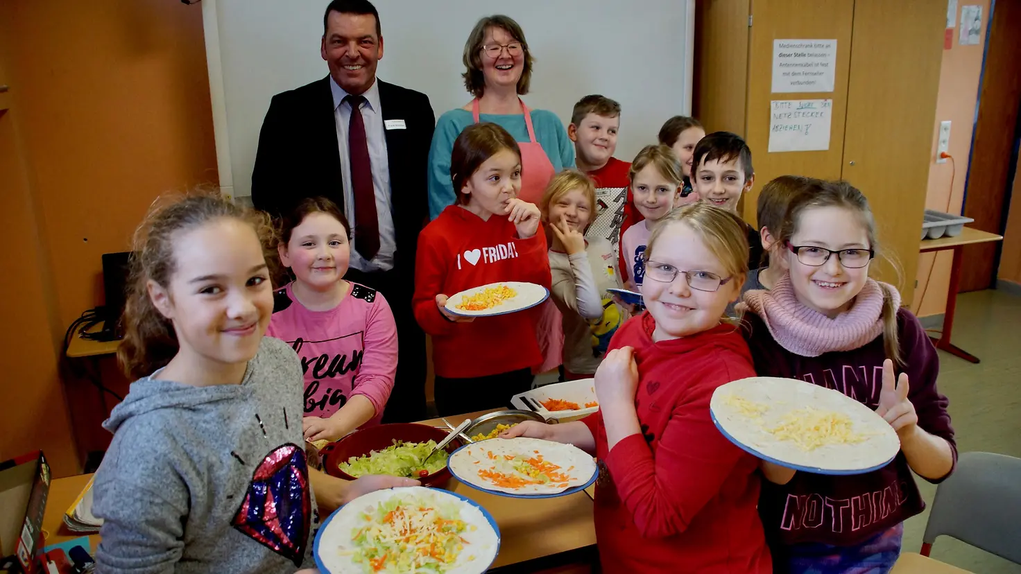 Margit Weyandt, Genussbotschafterin der Schule, erklärte: „Den Zuschuss der Barmer setzen wir für den Kauf von Lebensmitteln ein. Bis zu zwölf Kinder bereiten in einer Arbeitsgruppe wöchentlich gesunde Speisen zu und erhalten nützliche Tipps sowie wertvolle Informationen zum Umgang mit Lebensmitteln.“ Die Kinder hätten an der Zubereitung des gemeinsamen Essens viel Freude. Bei der kindgerechten Kochaktion in der Schule stand die Zubereitung von Vollkorn-Power-Wraps auf dem Speiseplan. Das sind dünne, gewickelte Fladenbrote, die unter anderem mit Frischkäse, Möhren, Käse, Salat und Mais gefüllt werden. „Das Team und die Kinder der St. Marien Grundschule Speicher bedanken sich für diese tolle Initiative und freuen sich auf weitere interessante Arbeitsgruppen- und Projekttage“, sagte Weyandt.