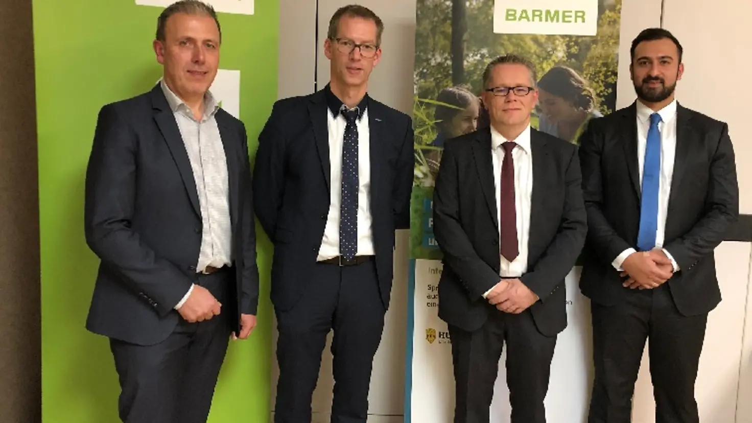 Präsentierten nützliche Tipps zu Sozialversicherung, digitalem Lohnbüro und betrieblicher Krankenversicherung bei der Veranstaltung „Einblicke“ (v.l.n.r.): Steuerberater Volker Andres, Roland Geisbüsch (Barmer), Basco Schroe (HUK Coburg) und Volkan Simsek (Barmer). Foto: Barmer