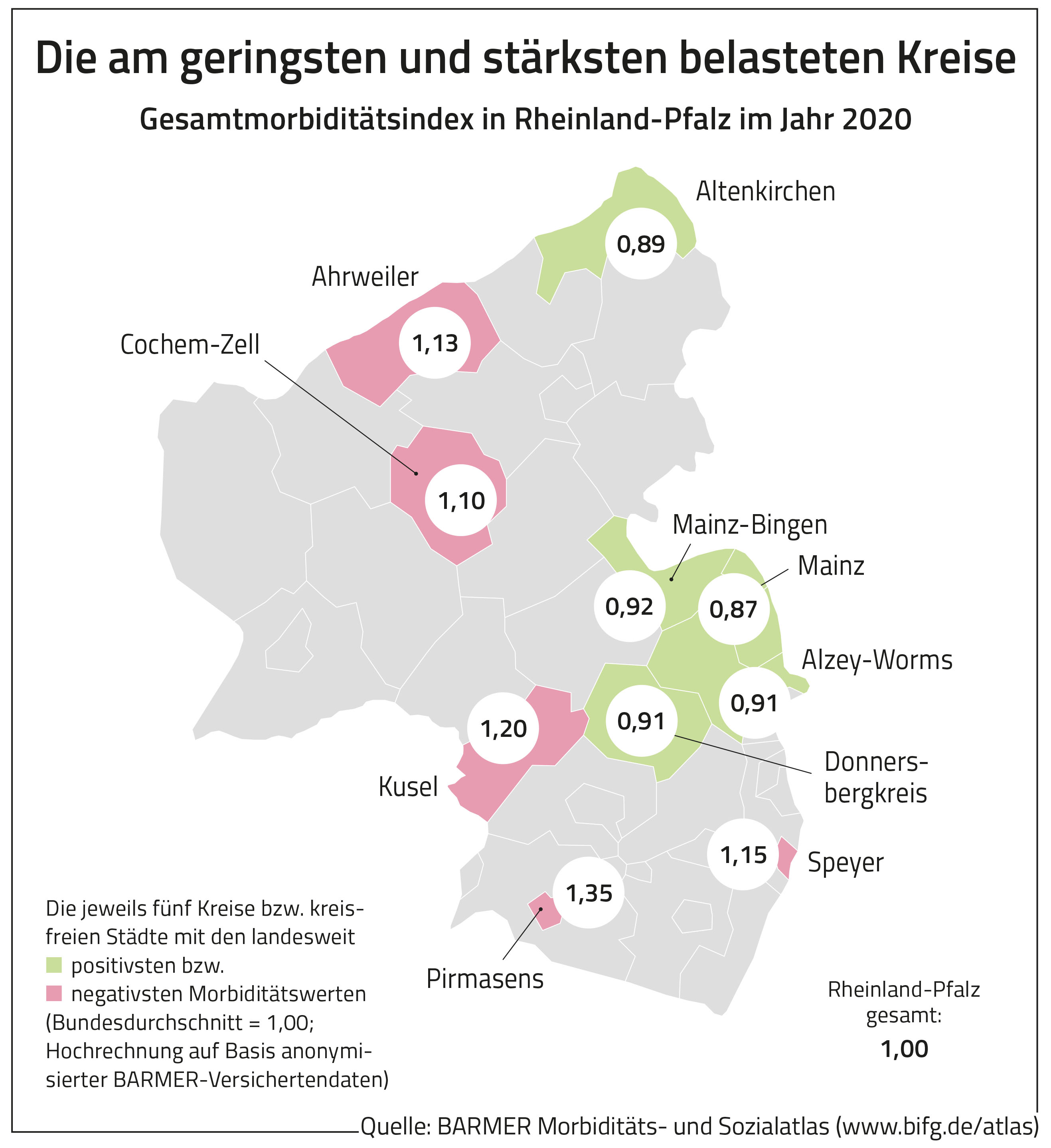 Mainz, 16. November 2022 – Die Menschen in Mainz sind die gesündesten in Rheinland-Pfalz. Sie tragen im Vergleich zum Bundesgebiet nur 87 Prozent der durchschnittlichen Krankheitslast. Am stärksten belastet ist die kreisfreie Stadt Pirmasens mit einer Gesamtbelastung von 135 Prozent. Das geht aus dem Morbiditäts- und Sozialatlas des Barmer Instituts für Gesundheitssystemforschung (bifg) hervor. Der Atlas zeigt auf der Basis anonymisierter und standardisierter Versichertendaten, wie stark die Bevölkerung in Rheinland-Pfalz von Krankheit betroffen ist. „Der Morbiditäts- und Sozialatlas bietet ein realistisches Bild zur gesundheitlichen Situation der Menschen in Rheinland-Pfalz. Er ermöglicht darüber hinaus detaillierte Aussagen zu wichtigen Krankheiten, zeigt regionale Unterschiede und stellt den Einfluss von Geschlecht, Alter, Einkommen, Bildung und Branche auf die Krankheitslast dar. Interaktive Grafiken erleichtern den Zugang dabei enorm“, sagt Dunja Kleis, Landesgeschäftsführerin der Barmer in Rheinland-Pfalz.