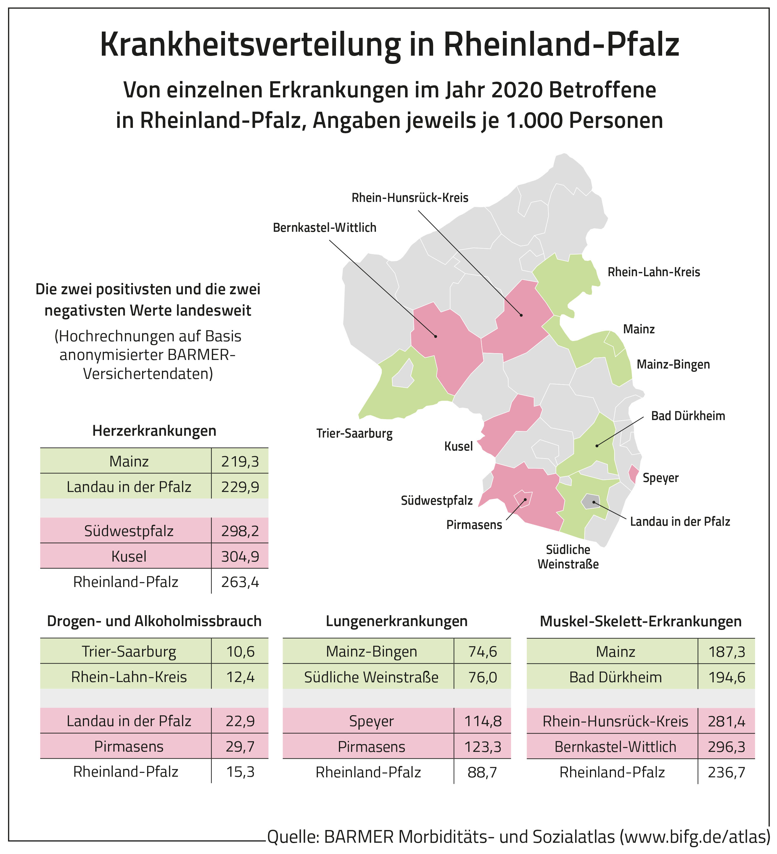 Laut dem Morbiditäts- und Sozialatlas gibt es in keinem Bundesland weniger Fälle von Alkohol- und Drogenmissbrauch als in Rheinland-Pfalz. Landesweit leiden rund 15 Personen je 1.000 Einwohnerinnen und Einwohner an diesem Krankheitsbild. Dabei reicht die Rate je 1.000 Personen von elf Erkrankten im Landkreis Trier-Saarburg bis hin zu 30 in Pirmasens. Bei Herzerkrankungen liegt Rheinland-Pfalz mit 263 Betroffenen je 1.000 Einwohner rund zwei Prozent über dem Bundesdurchschnitt. Am meisten Herzkranke gibt es demnach im Landkreis Kusel mit 305 Fällen je 1.000 Einwohner und am wenigsten in Mainz mit 219 je 1.000 Personen. „Der Atlas zeigt, dass in Rheinland-Pfalz jede zweite Person über 60 Jahren herzkrank ist“, sagt Kleis. Herzprobleme seien tendenziell ein Altersleiden. Mit solchen Erkenntnissen könne der Atlas wichtige Impulse für die Prävention setzen. Dabei gehe es zum Beispiel um die Frage, wie das Betriebliche Gesundheitsmanagement noch zielgruppengerechter ausgebaut werden könne, etwa für ältere Beschäftigte.