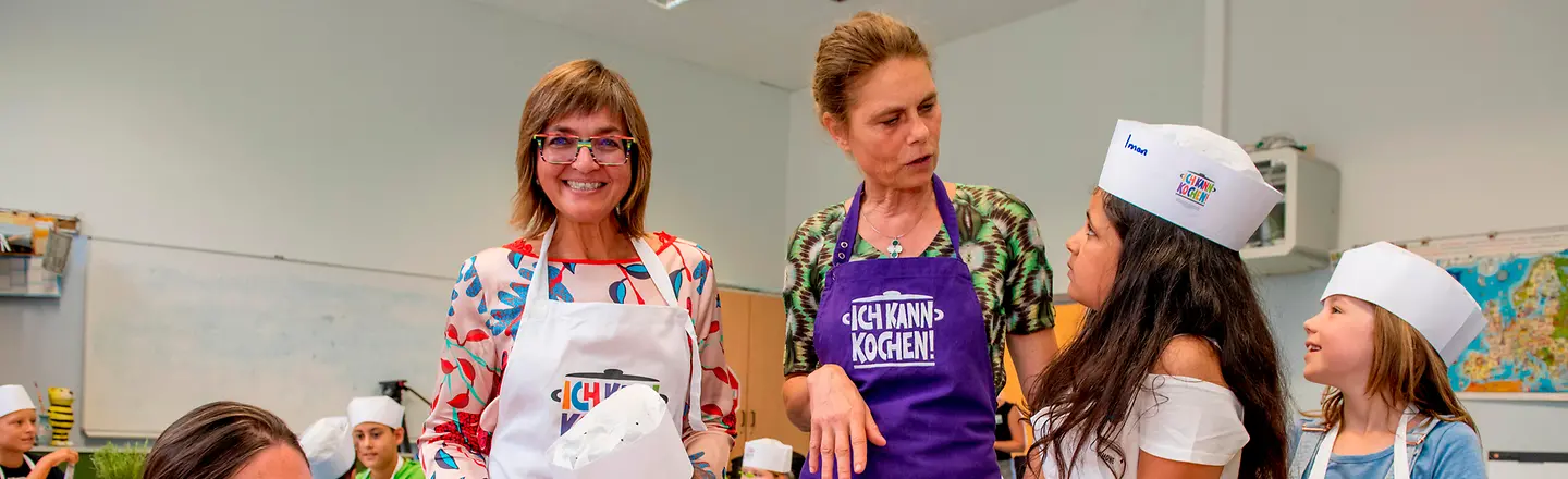 Zum Auftakt der Partnerschaft besuchten Köchin und Stiftungsgründerin Sarah Wiener, Ernährungsministerin Ulrike Höfken und Dunja Kleis, Landesgeschäftsführerin der Barmer in Rheinland-Pfalz und im Saarland, die Ich kann kochen!-Kinderkochgruppe an der Leibnizschule in Mainz. In der Grundschule ernannten Wiener und Kleis die Ministerin offiziell zur ersten Ich kann kochen!-Botschafterin in Rheinland-Pfalz. Im Anschluss ließen sich die Besucherinnen von den Kindern und der Gruppenleiterin Marina Wagner zeigen, wie sie die Rezepte und Ideen der Initiative umsetzen und griffen selbst zu Messer und Schneidebrett. Wagner hatte 2017 eine Fortbildung von Ich kann kochen! besucht und vermittelt den Kindern der Schule als sogenannte Genussbotschafterin seither die Begeisterung für das Kochen und eine ausgewogene Ernährung.