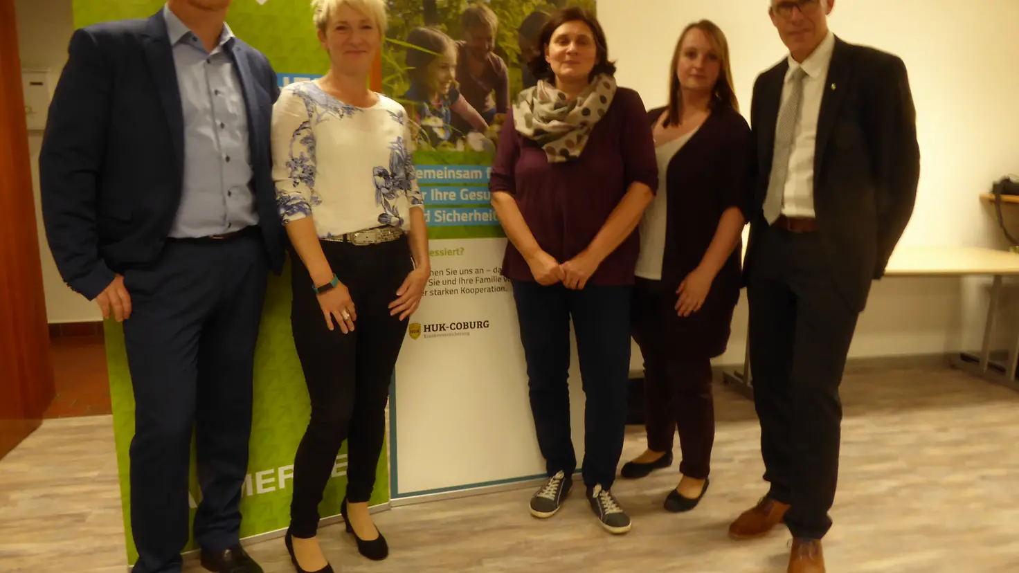 Gaben bei einer Veranstaltung in der Sozialstation Kusel wertvolle Informationen zur Pflege (v.l.n.r.): Jörg Peter (Barmer), Doreen Fuchs (Kreisverwaltung Kusel), Susanne Miller (Sozialstation Kusel), Diana Baumann (Geschäftsführerin Sozialstation Kusel) und Andreas Burchert (HUK-Coburg). Foto: HUK