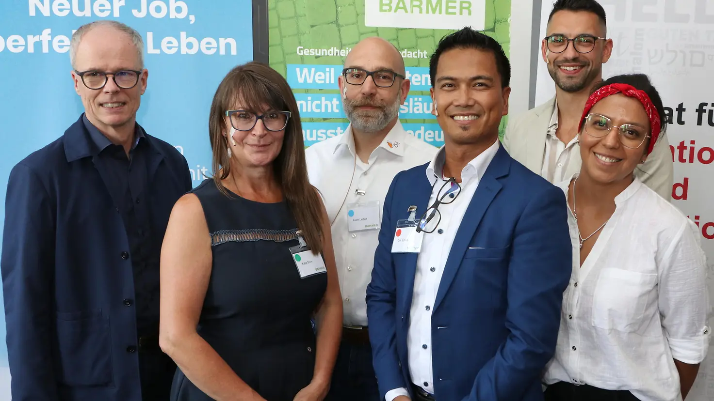 Diskutierten über die Gewinnung und Sicherung ausländischer Pflegefachkräfte (v.l.n.r.): Christoph Becker, Katja Stein, Frank Liebelt, Daniel Schaefer, Duniel Cardenas-Rodriguez und die kolumbianische Pflegekraft Cindy Paola Zapata Bustos (Gemeinschaftsklinikum Mittelrhein). Foto: Barmer/Olaf Schepers