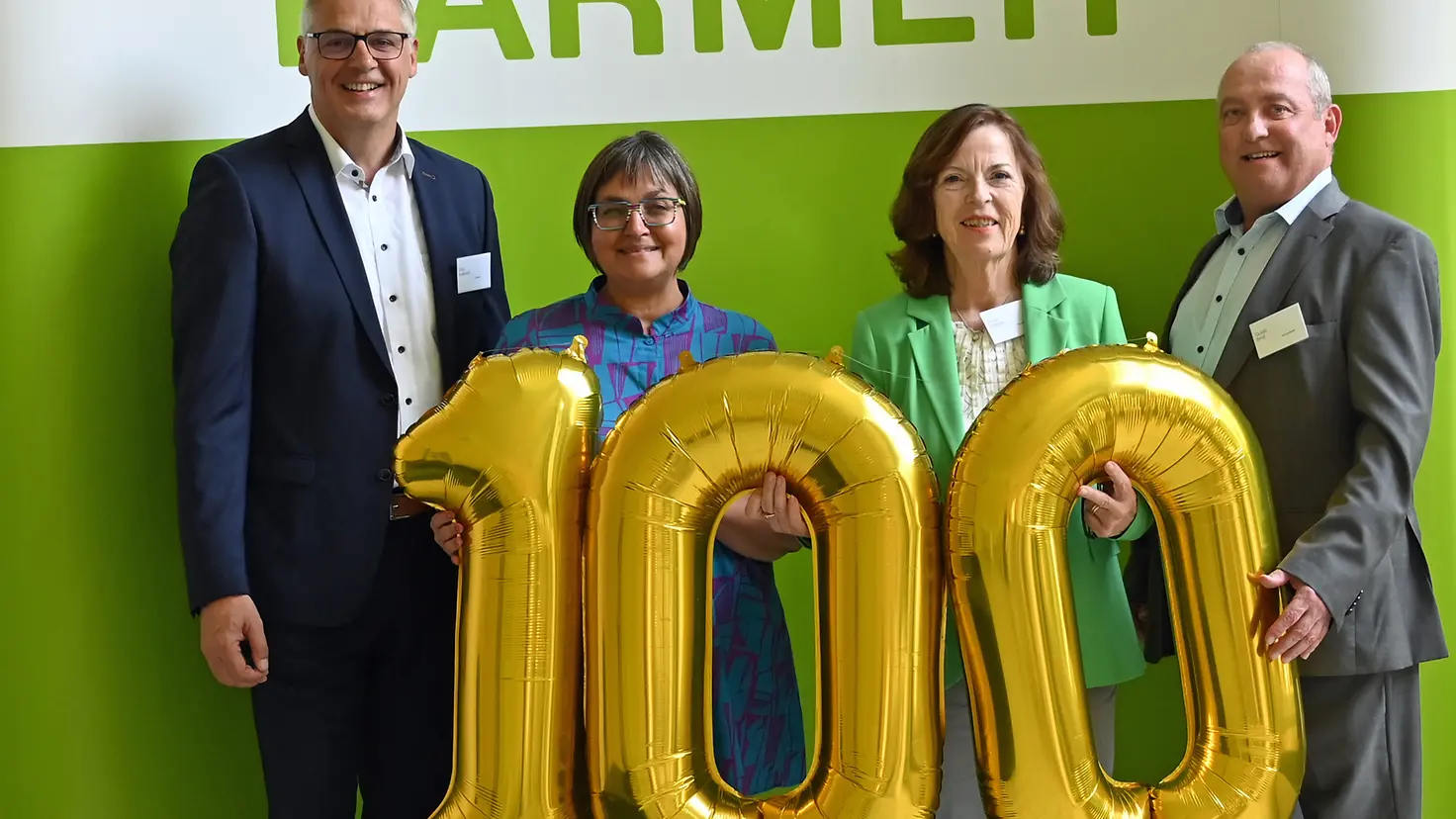 100 Jahre Barmer in Trier: Barmer-Geschäftsführer Jörg Kalkstein (l.), Barmer-Landesgeschäftsführerin Dunja Kleis (2.v.l.), die Trierer Bürgermeisterin Elvira Garbes und Barmer-Hauptgeschäftsführer Guido Ernst bei der Jubiläumsveranstaltung. Foto: Barmer/Alfred Weinandy