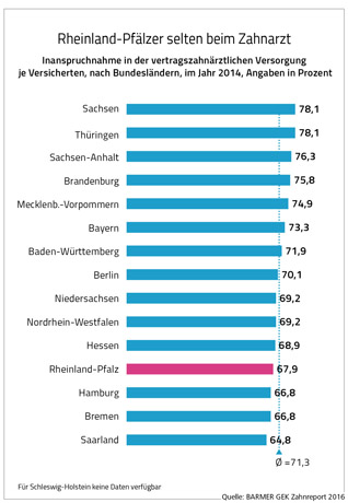 Im Jahr 2014 haben 67,9 Prozent der Rheinland-Pfälzer einen Zahnarzt aufgesucht. Damit lagen sie unter dem Bundesdurchschnitt von 71,3 Prozent und deutlich hinter dem Spitzenreiter Sachsen, wo 78,1 Prozent der Menschen zum Zahnarzt gingen. Noch seltener fanden sich nur die Saarländer (64,8 Prozent), Hamburger und Bremer (je 66,8 Prozent) bei ihrem Zahnarzt ein. . Im Vergleich zum Jahr 2013 blieb der Anteil der Rheinland-Pfälzer (67,4 Prozent) und Saarländer (63,5 Prozent), die einen Zahnarzt besuchten, fast unverändert. Innerhalb von Rheinland-Pfalz und dem Saarland gibt es dagegen deutliche Unterschiede. Am häufigsten gingen in Rheinland-Pfalz die Bewohner der Landkreise Mainz-Bingen und Cochem-Zell (je 69,8 Prozent) zum Zahnarzt. Schlusslichter sind die kreisfreie Stadt Pirmasens (61,7 Prozent) und der Eifelkreis Bitburg-Prüm (63,2 Prozent). Im Saarland gingen die Bewohner des Saarpfalz-Kreises (66,4 Prozent) und des Landkreises Saarlouis (65,9 Prozent) am häufigsten zum Zahnarzt. Schlusslichter sind in dieser Kategorie der Landkreis Neunkirchen (63,0 Prozent) und der Regionalverband Saarbrücken (63,7 Prozent).