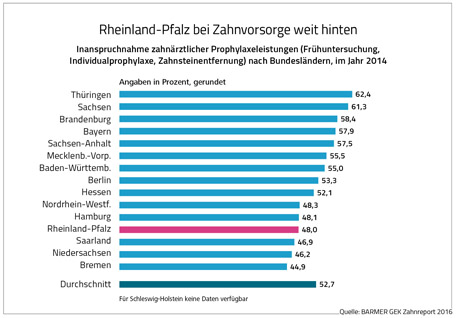 Es gibt weitere Anhaltspunkte dafür, dass Rheinland-Pfälzer und Saarländer im Vergleich mit den Bewohnern anderer Bundesländer eher Zahnarztmuffel sind. Prophylaxe-Leistungen nahmen 2014 nur 48,0 Prozent (Bundesdurchschnitt: 52,7 Prozent) der Rheinland-Pfälzer in Anspruch. Lediglich in Niedersachsen, Bremen und dem Saarland (46,9 Prozent) taten dies noch weniger Menschen.