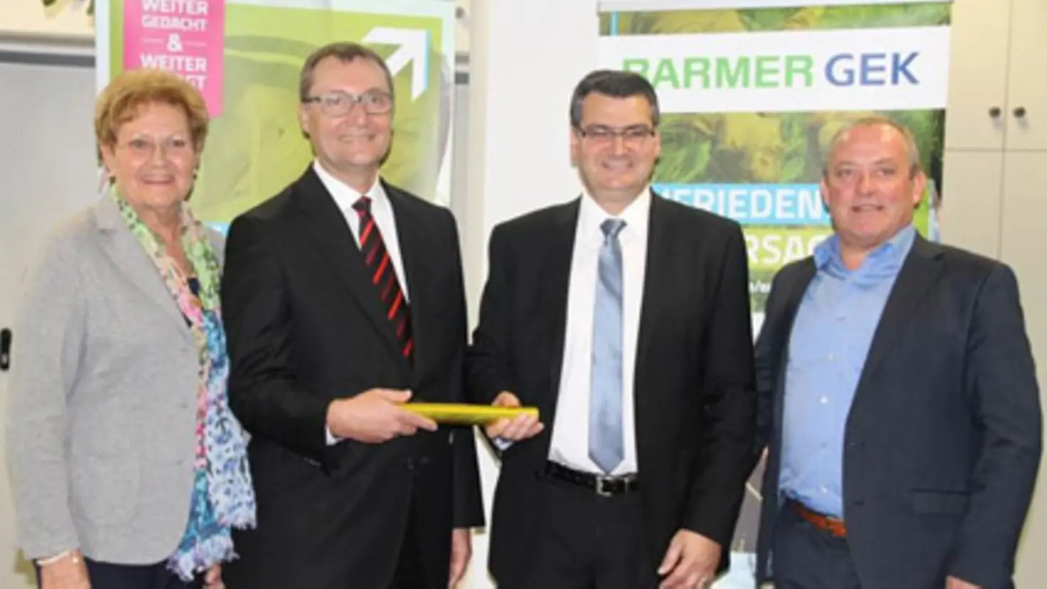 Im Beisein der saarländischen Gesundheitsministerin Monika Bachmann und Barmer GEK Hauptgeschäftsführer Guido Ernst (r.) übergibt Jens Rauh (2v.l.) symbolisch ein Staffelholz an den neuen Regionalgeschäftsführer der Barmer GEK in Saarbrücken, Adrian Zöhler.