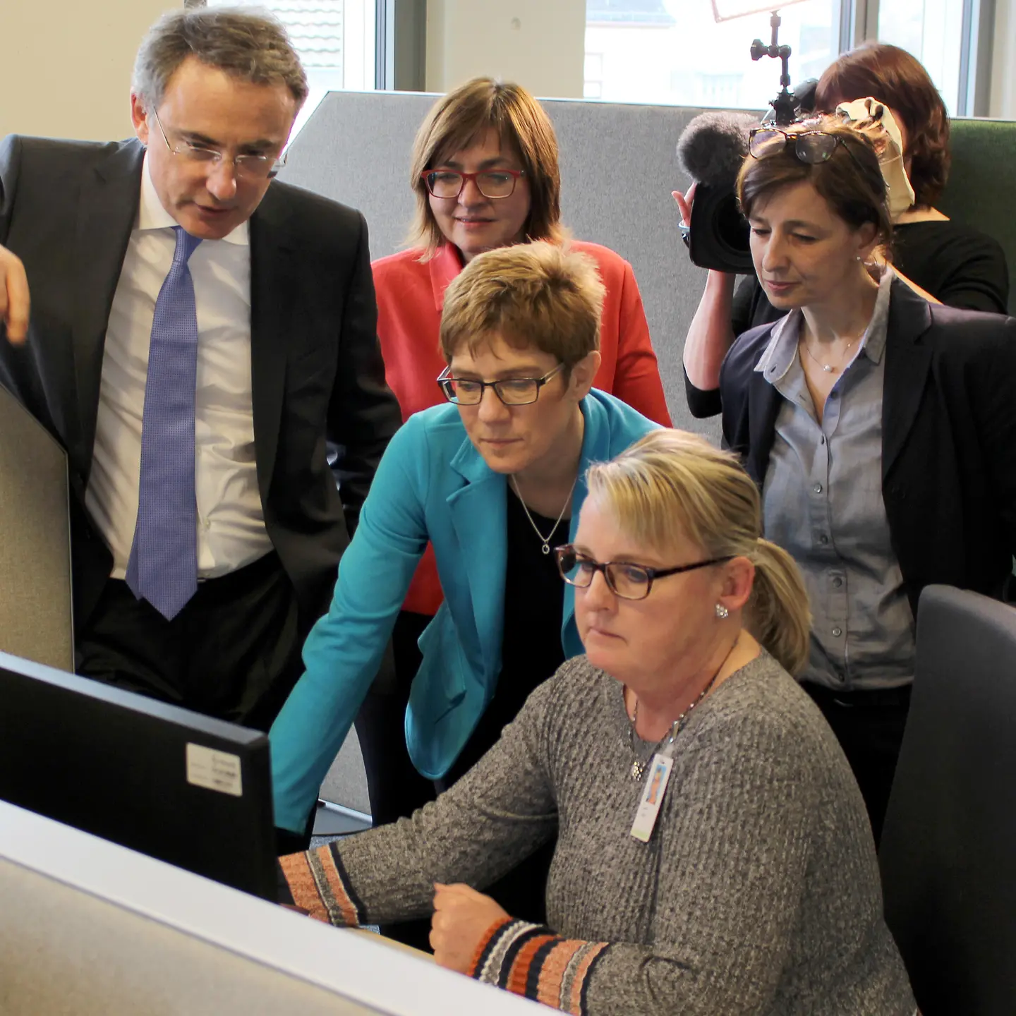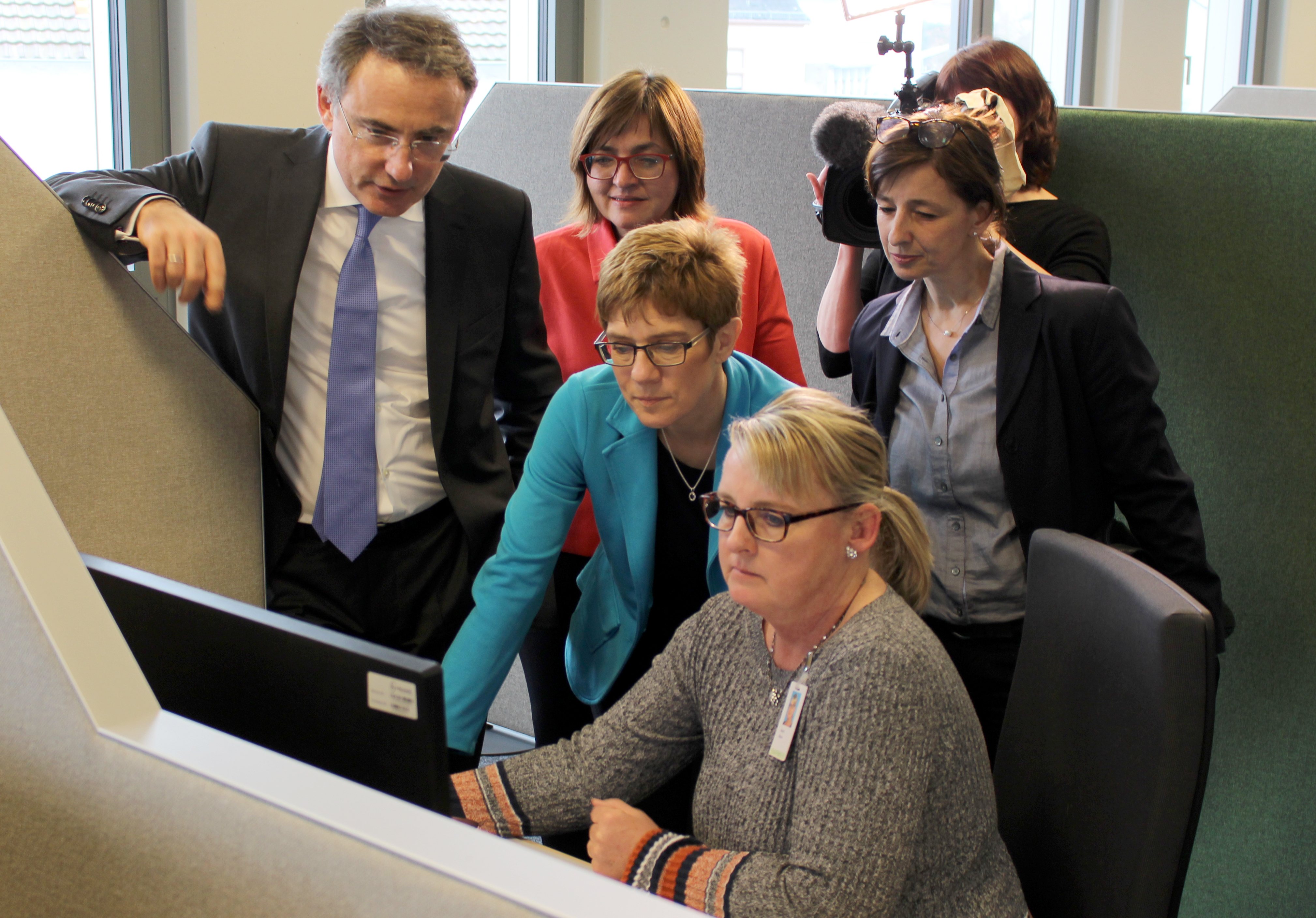 Prof. Dr. Christoph Straub (links), Annegret Kramp-Karrenbauer (Mitte), Dunja Kleis (Mitte hinten), und Landrätin Daniela Schlegel-Friedrich (rechts) lassen sich von einer Mitarbeiterin der Barmer Telefongeschäftsstelle in Merzig die Arbeitsabläufe in einer Telefongeschäftsstelle zeigen. Foto: Barmer