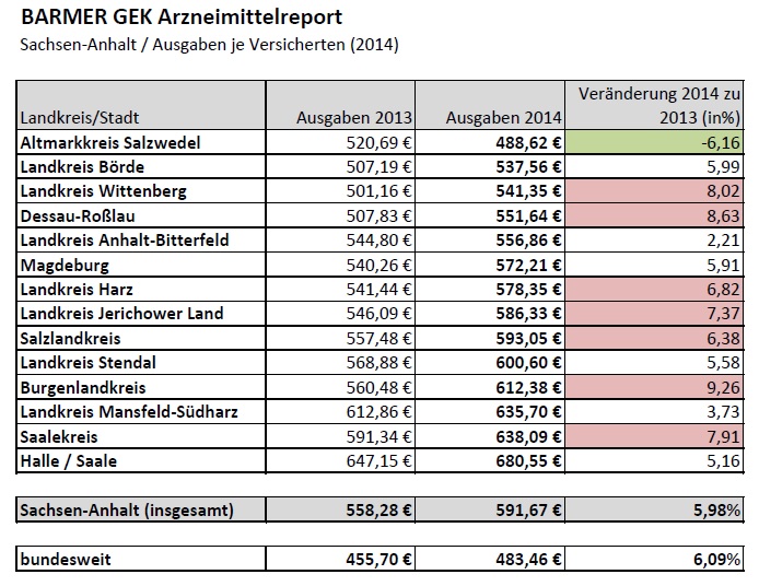 Der Barmer GEK Arzneimittelreport belegt erhebliche regionale Abweichungen von bis zu 200 Euro je Versicherten in Sachsen-Anhalt. "Die geringsten durchschnittlichen Medikamentenausgaben hatten wir 2014 im Altmarkkreis Salzwedel (489 Euro), im Landkreis Börde (538 Euro) und in der Region Anhalt (541 bis 557 Euro)", so Wiedemann. Hingegen wurden im Süden des Bundeslandes die höchsten Ausgaben für Medikamente registriert; sie reichten von 612 Euro im Burgenlandkreis bis zu 681 Euro in Halle/Saale. Dabei sanken die Ausgaben im Vergleich zum Vorjahr lediglich in der westlichen Altmark (minus 6 Prozent). In allen anderen Regionen des Landes gab es Ausgabensteigerungen von teilweise über 9 Prozent (vgl. Tabelle).