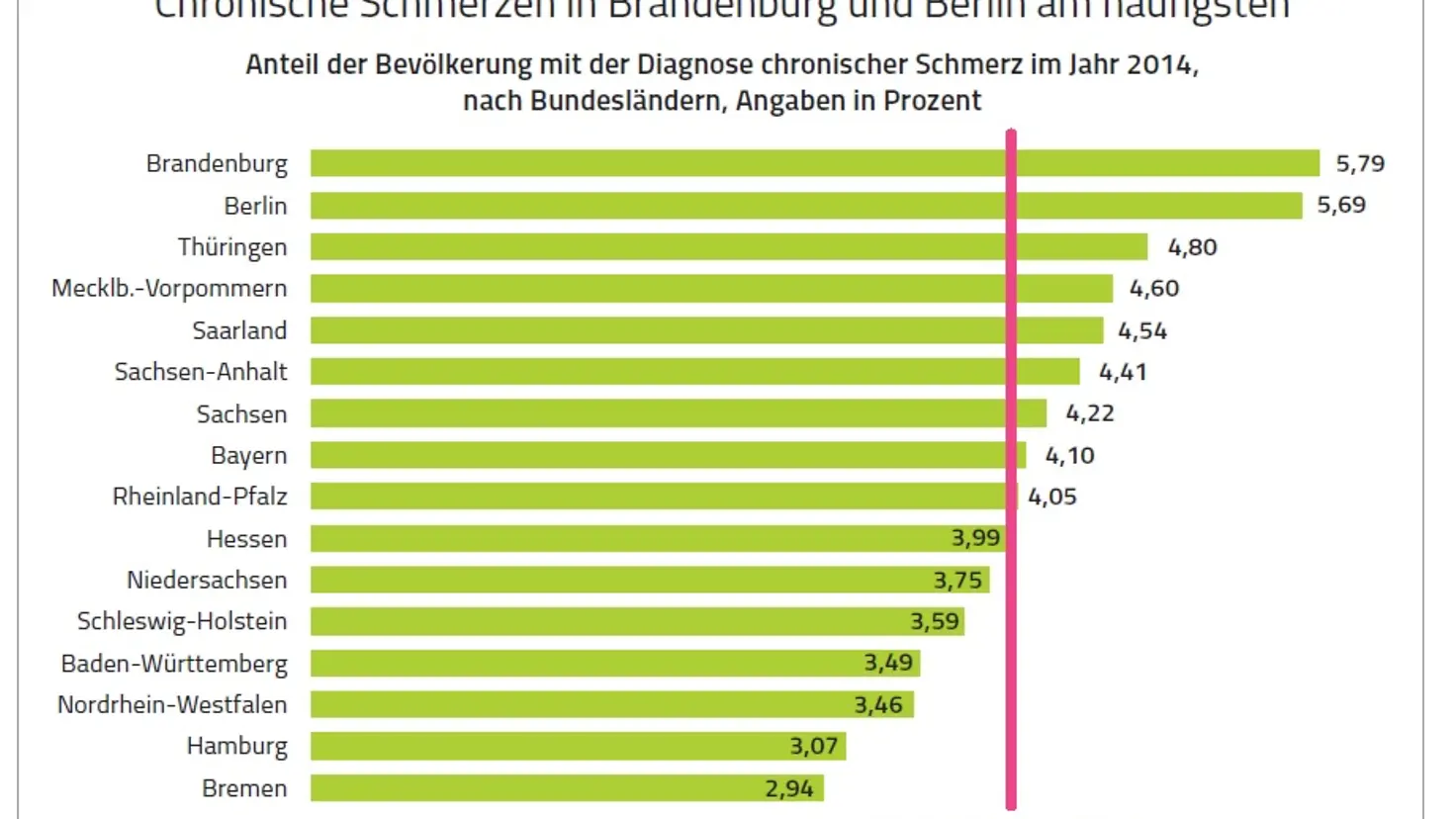 In Sachsen-Anhalt zeigt sich bei Schmerzdiagnosen kein einheitliches Bild. So reicht die Häufigkeit der ärztlichen Diagnose "Chronische Schmerzen" von 2,7 Prozent im Burgenlandkreis bis zu relativ hohen 5,6 Prozent im Salzlandkreis. Auch in der ärztlichen Abrechnungsposition "Grundpauschale schmerztherapeutischer Patient" hat die Barmer GEK deutliche Unterschiede festgestellt: Von 0,25 Prozent aller Versicherten im Landkreis Mansfeld-Südharz bis zu 1,68 Prozent im Salzlandkreis – etwa zwei Mal so hoch wie im Bundesdurchschnitt!
