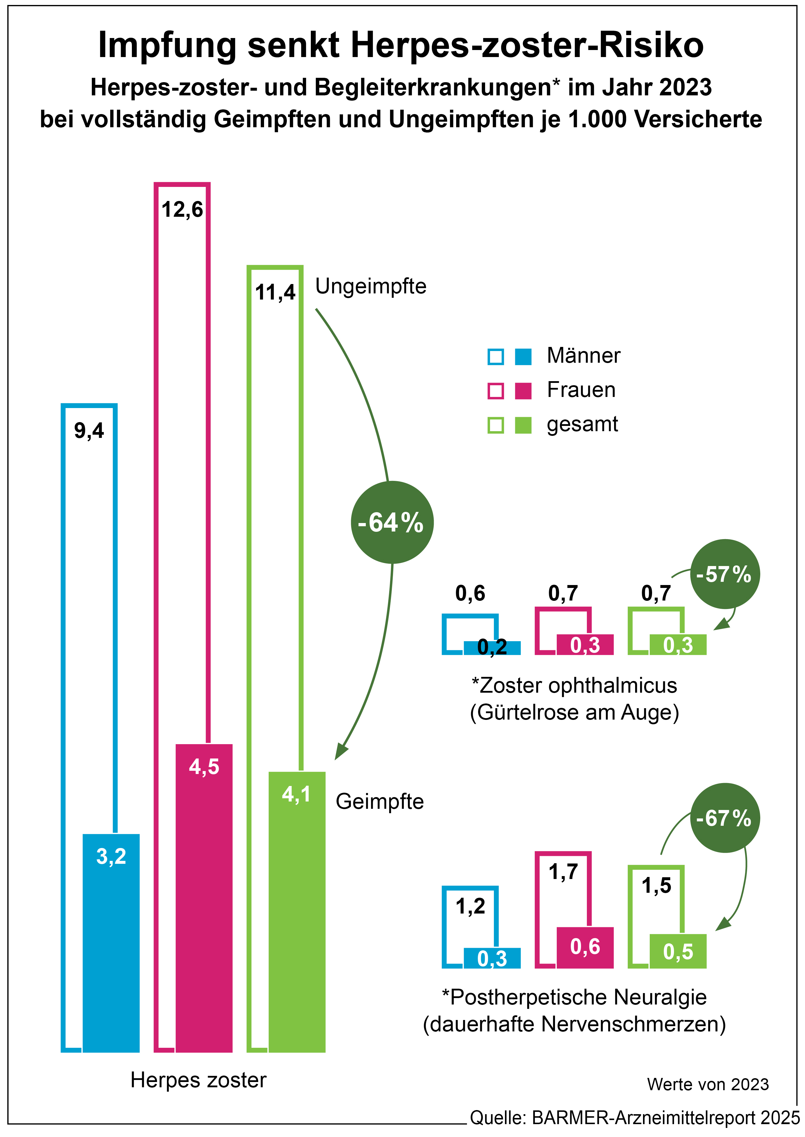 Der Arzneimittelreport zeigt, dass vor allem ältere Menschen in Sachsen-Anhalt an Gürtelrose erkranken. Demnach sind die Über-60-Jährigen um 58 Prozent häufiger betroffen als jene zwischen 18 und 59 Jahren. Mit steigendem Alter treten auch häufiger Folgeerkrankungen auf. So erleiden die Über-60-Jährigen mehr als doppelt so häufig Gürtelrose mit Beteiligung des Auges und 1,7-mal häufiger andauernde Nervenschmerzen. „Gürtelrose kann mit schwerwiegenden Komplikationen einhergehen. Wird beispielsweise der Sehnerv in Mitleidenschaft gezogen, kann das zu Erblindung führen. Auch neurologische Komplikationen können entstehen. Mit einer Impfung kann hier ganz einfach vorgebeugt werden“, sagt Prof. Dr. Thomas Frese, Direktor des Instituts für Allgemeinmedizin an der Universitätsmedizin Halle (Saale) und niedergelassener Hausarzt. Laut Barmer-Report sinkt das Erkrankungsrisiko bei vollständiger Impfung um 64 Prozent. Auch Komplikationen treten durch die Impfung seltener auf.