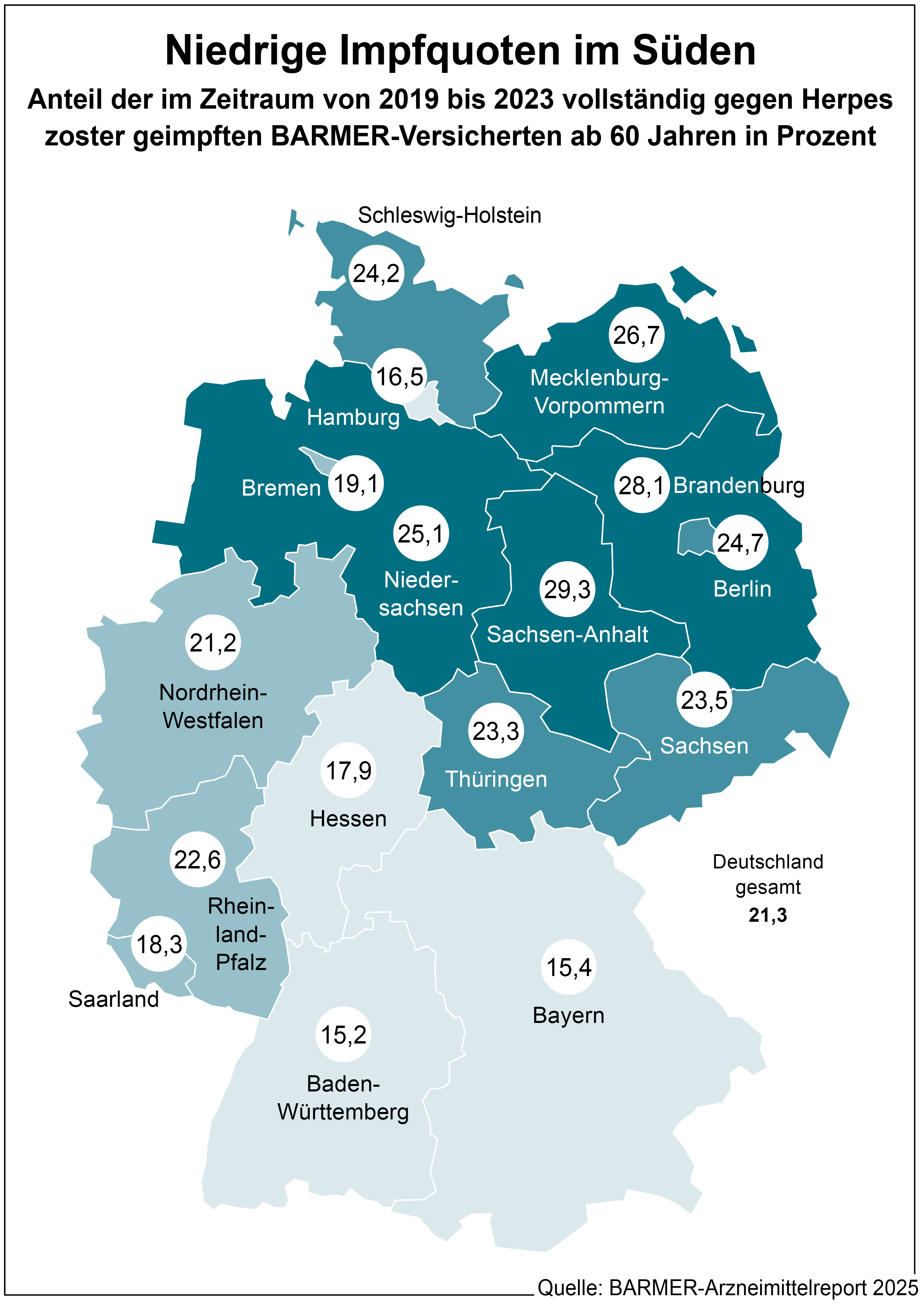 Dem Arzneimittelreport zufolge gibt es regionale Unterschiede bei der Inanspruchnahme der Herpes-zoster-Impfung. In Sachsen-Anhalt liegt die Impfquote bei 29,3 Prozent und damit bundesweit am höchsten. Zum Vergleich: In Baden-Württemberg sind lediglich 15,2 Prozent der Anspruchsberechtigten gegen Herpes zoster geimpft. „Diese regionalen Unterschiede haben wir zuvor bereits bei Kinderimpfungen erkannt. Sie zeigen, dass auch in Sachsen-Anhalt die Impfquote mit Informations- und Aufklärungskampagnen weiter gesteigert werden kann“, so Dziuk.