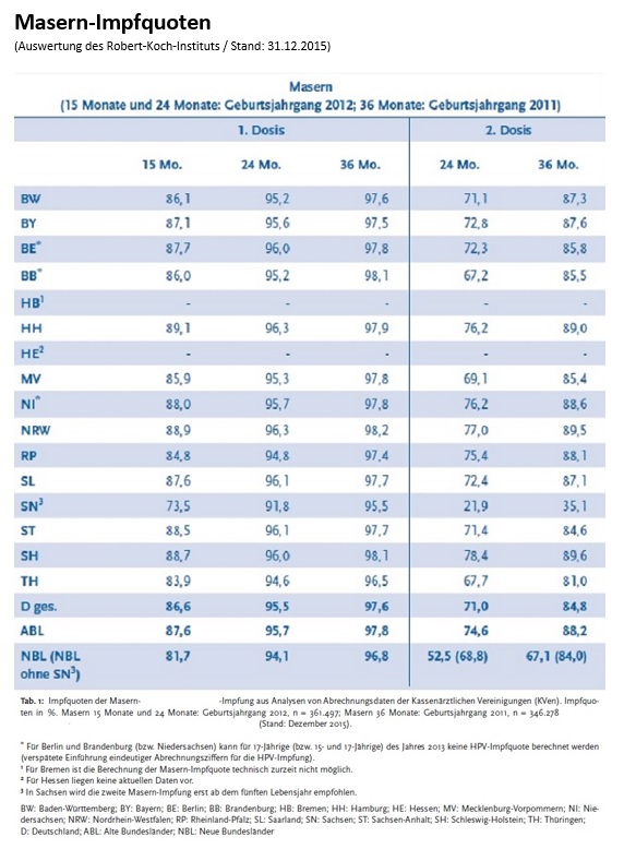 Aus Sicht der Barmer GEK ist es höchste Zeit für ein solches Umdenken. Erst vor wenigen Tagen hatte das Robert Koch-Institut darauf hingewiesen, dass es mit 2.605 Masernfällen im Jahr 2015 so viele Infektionen wie selten in Deutschland gegeben hatte. Auch hatte das Robert Koch-Institut kritisiert, dass die Impfraten zu gering seien, vor allem bei den Einjährigen und im Osten Deutschlands. "Konnte man noch vor einigen Jahren sagen, dass die Westdeutschen eher Impfmuffel und die Ostdeutschen eher Impfbefürworter sind, lässt sich diese Einschätzung bei Masern-Schutzimpfungen für Kleinkinder heutzutage nicht mehr halten", sagt Thomas Nawrath. So liegt laut Robert Koch-Institut Sachsen mit einer Impfquote von lediglich 35 Prozent der 3-Jährigen weit unter dem Bundesdurchschnitt von 85 Prozent. Auch Thüringen (81%) und Sachsen-Anhalt (85%) liegen unter dem Durchschnitt, die Bundesländer Mecklenburg-Vorpommern, Berlin und Brandenburg (je 86%) knapp darüber; während Schleswig-Holstein (fast 90%), Nordrhein-Westfalen und Hamburg (je 89%) bundesweit an der Spitze bei Masern-Schutzimpfungen liegen.