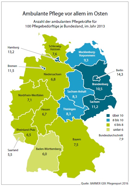 Die Analysen des Barmer Pflegereports haben zwischen den Regionen Sachsen-Anhalts z.T. erhebliche Unterschiede registriert. So sind nur 19,5 Prozent aller Pflegebedürftigen im Saalekreis in vollstationärer Dauerpflege, gefolgt vom Burgenlandkreis (21,2 %) und dem Kreis Mansfeld-Südharz (24,3 %). Auch die Stadt Halle (Saale) liegt mit 26 Prozent noch unter dem Landes- und Bundesdurchschnitt. Die höchsten Werte für stationäre Dauerpflege markieren hingegen Magdeburg (34,5 %), Dessau-Roßlau (32,8 %), der Salzlandkreis und das Jerichower Land (je 31,7 %).