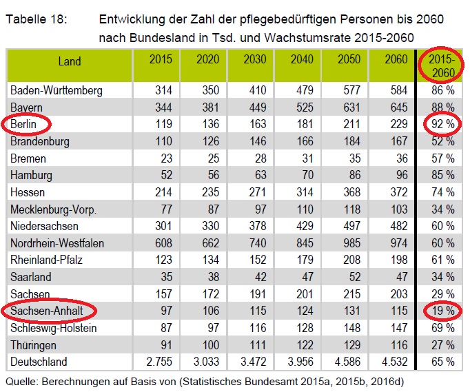 Sachsen-Anhalt zählt zu den Bundesländern mit dem höchsten Anteil an Pflegebedürftigen: „Denn rund 99.000 Pflegebedürftige im Jahr 2015 bedeuten, dass nahezu jeder 20. Sachsen-Anhalter Leistungen aus der Pflegeversicherung erhält“, sagt Barmer-Landesgeschäftsführer Axel Wiedemann bei der Vorstellung des Pflegereports in Magdeburg. „Und wenn wir auf die Entwicklung der Pflegezahlen seit 1999 schauen, dann liegt unser Bundesland mit einem Anstieg der zu Pflegenden von 39 Prozent erwartungsgemäß weit vor vielen anderen Flächenländern. Doch überraschender Weise liegen wir nicht nur hinter Thüringen (+ 44%), Mecklenburg-Vorpommern (+ 59%) und Brandenburg (+ 60%) sondern mittlerweile auch hinter Hessen (+ 41%) und Baden-Württemberg (+ 42%)“, ergänzt Wiedemann. Es scheint, dass hier einige demografische Entwicklungen schneller aufgeholt wurden, als gedacht.