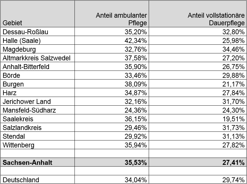 Hingegen hat Halle (Saale) mit 42,3 Prozent bei der ambulanten Pflege landesweit den höchsten Wert, gefolgt vom Burgenlandkreis (38,1 %) und dem Altmarkkreis Salzwedel (37,6 %). Die geringsten Anteile bei ambulanter Pflege haben der Kreis Mansfeld-Südharz (24,4 %), der Salzlandkreis (29,5 %) und der Landkreis Stendal (29,9 %)