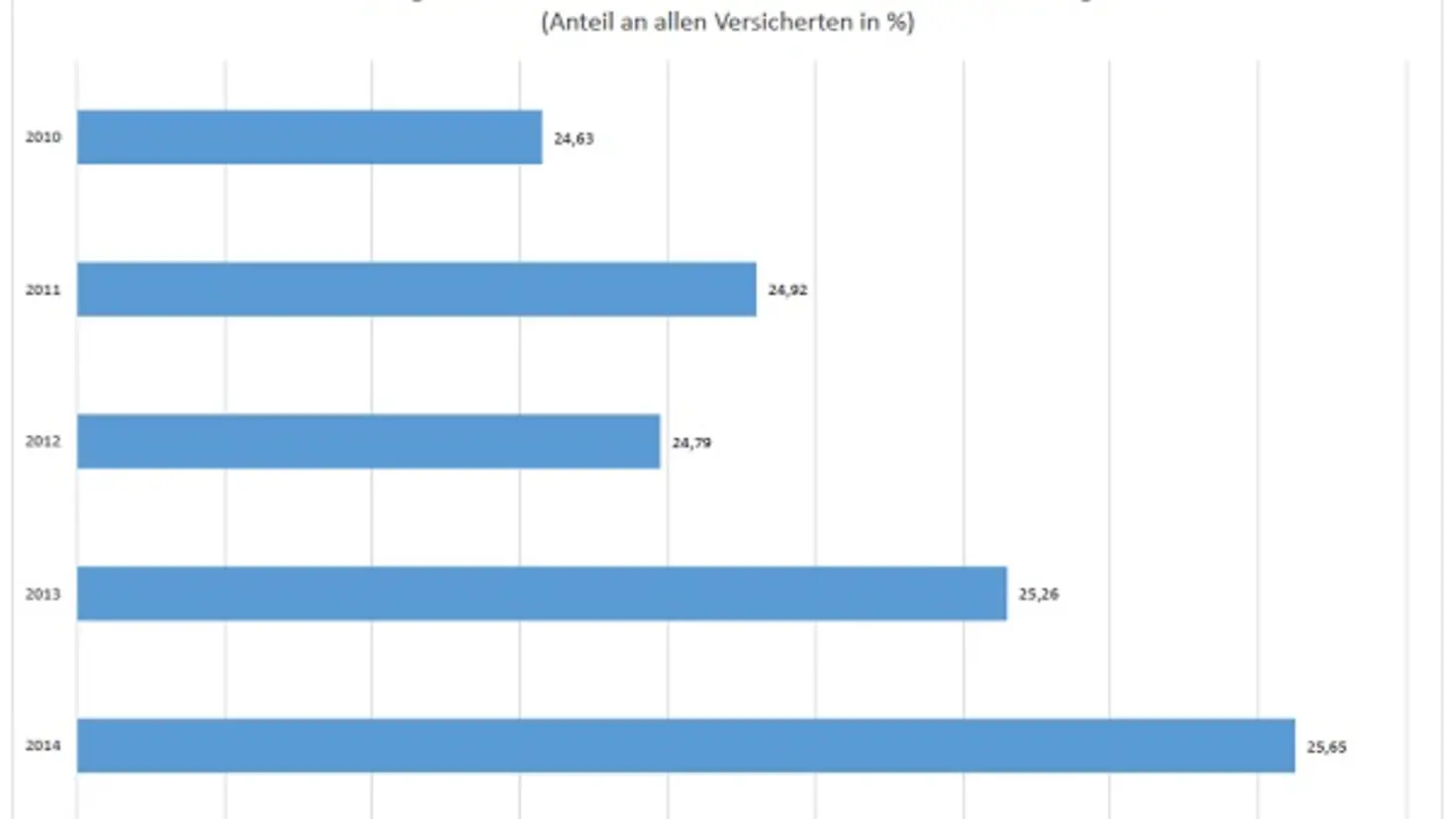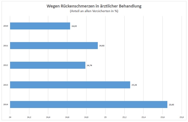 Laut aktuellem Barmer GEK Arztreport ist die Diagnosehäufigkeit von Rückenschmerzen in den vergangenen Jahren zudem kontinuierlich angestiegen. Entfielen im Jahr 2010 noch 24,6 Prozent aller ärztlichen Diagnosen auf Rückenschmerzen, so waren es 2012 bereits 24,8 Prozent und 2014 sogar 25,6 Prozent. "Auffallend ist, dass die Zunahme der Diagnosehäufigkeit sowohl bei Frauen als auch bei Männern fast gleichmäßig erfolgte. Und zwar von 27,9 auf 29,0 Prozent bei Frauen und von 21,2 auf 22,2 Prozent bei Männern", sagt Wiedemann.