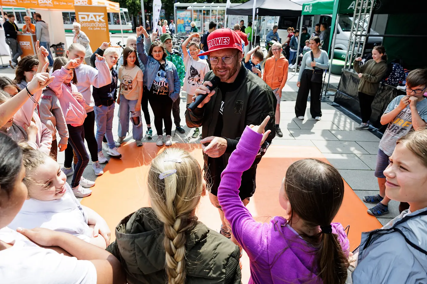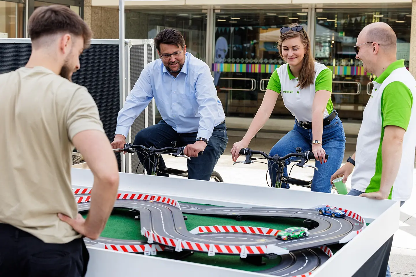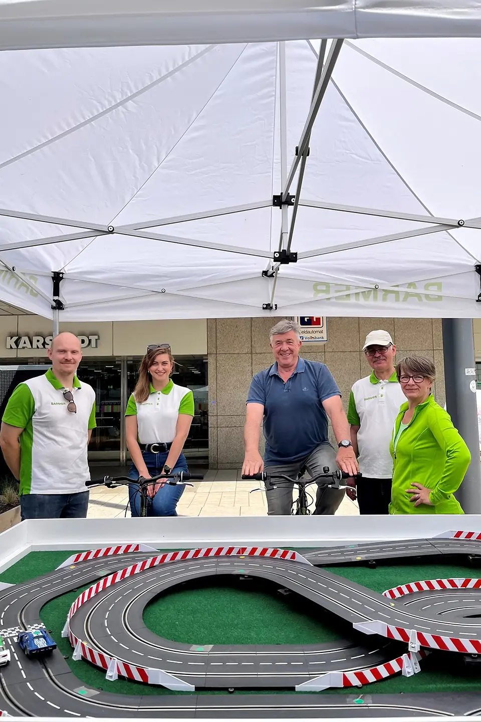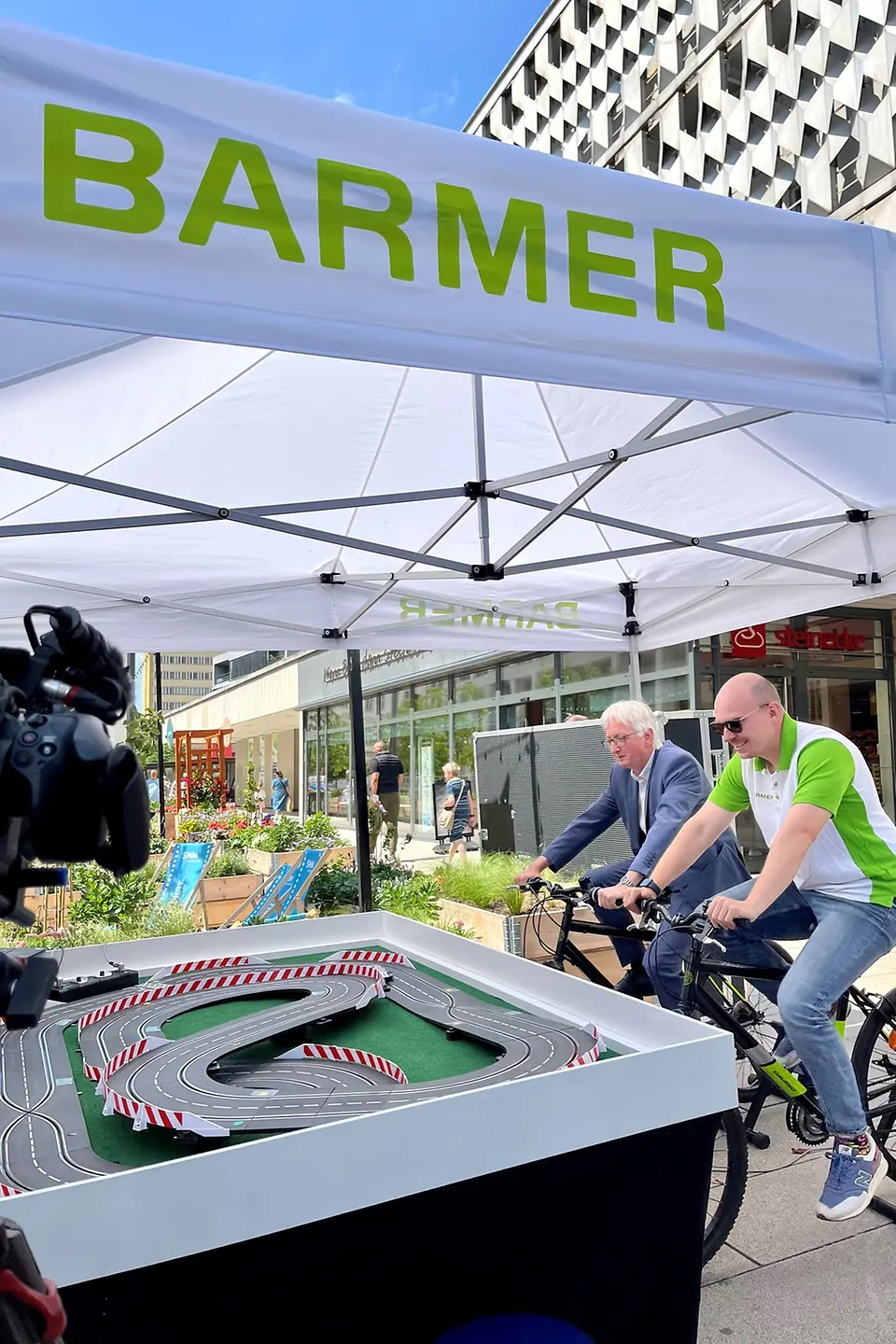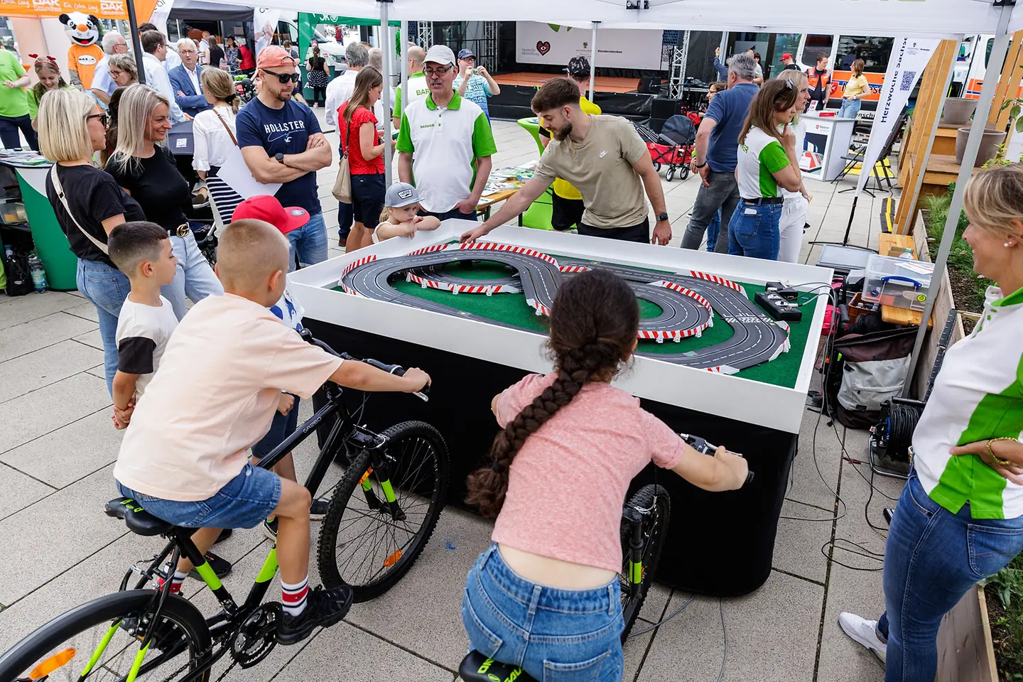 Beim Familienfest der Herzwoche in Magdeburg, dem Höhepunkt der Aufklärungskampagne, am Sonnabend, 8. Juni 2023, konnten Besucherinnen und Besucher am Stand der Barmer in die Pedale treten. Zwei Fahrräder waren an eine Carrera-Bahn angeschlossen. Wer strampelte – schnell, aber gefühlvoll – trieb so die Autos auf der Bahn an und konnte sich im Wettbewerb beweisen. Auch Sachsen-Anhalts Staatssekretär Wolfgang Beck (SPD) sowie der Landtagsabgeordnete Tobias Krull (CDU) bewiesen Ausdauer und Gefühl bei der Carrera-Bahn. Die Besucher konnten sich zudem über die zahlreichen Gesundheitsangebote der Barmer informieren – von Präventionsprogrammen über den Notfallpass bis hin zu Bewegungs- und Ernährungstipps.