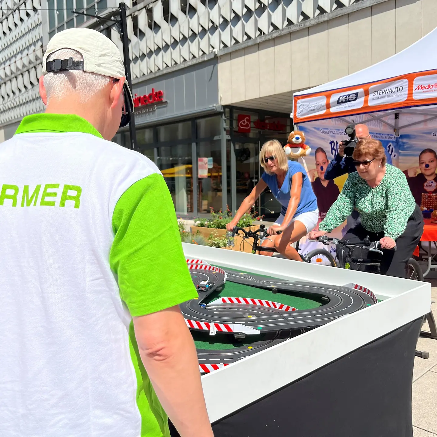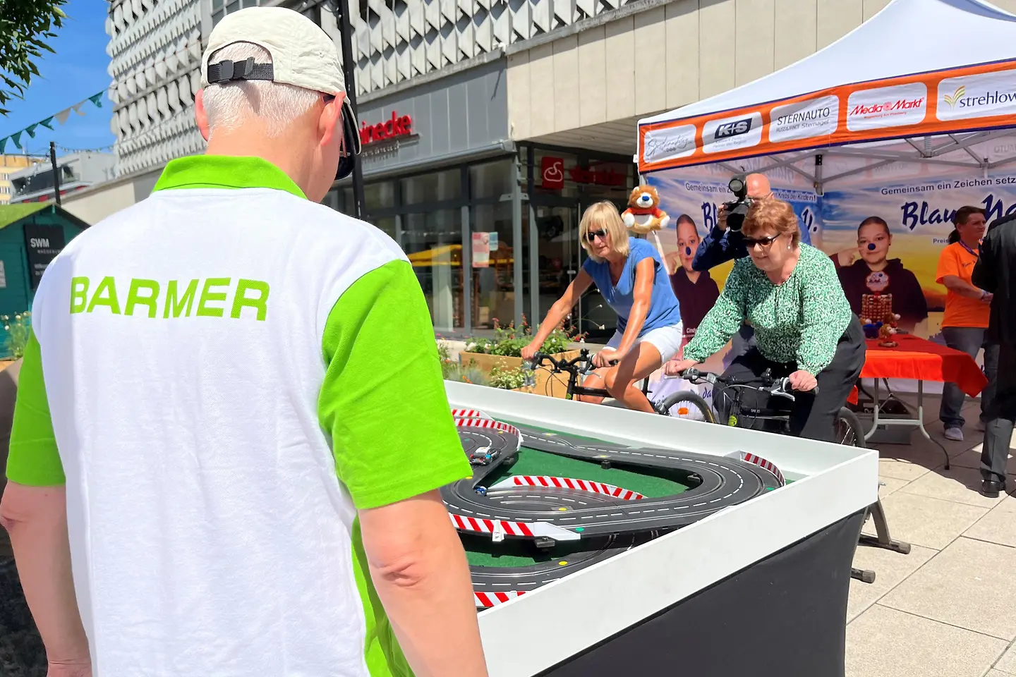 Beim Familienfest der Herzwoche am Sonnabend, 24. Juni 2023, in Magdeburg konnten Besucherinnen und Besucher am Stand der Barmer in die Pedale treten. Zwei Fahrräder waren an eine Carrera-Bahn angeschlossen. Wer strampelte – schnell, aber gefühlvoll – trieb so die Autos auf der Bahn an und konnte sich im Wettbewerb beweisen. Auch Sachsen-Anhalts Gesundheitsministerin Petra Grimm-Benne bewies Ausdauer und Gefühl bei der Carrera-Bahn. Weiterhin konnten sich die Besucher über die zahlreichen Gesundheitsangebote der Barmer informieren – von Präventionsprogrammen über den Notfallpass bis hin zu Bewegungs- und Ernährungstipps.