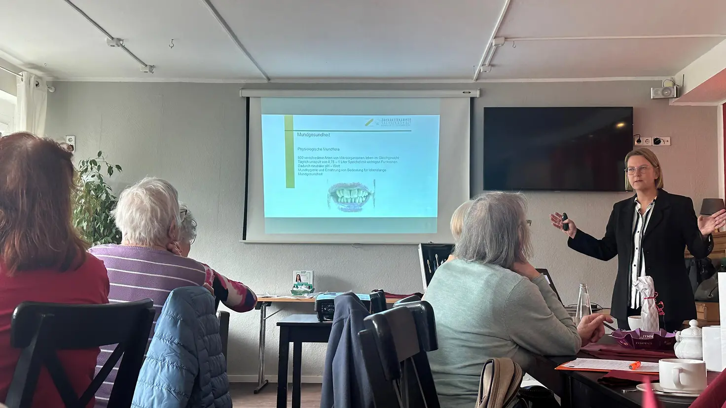 Dr. Nicole Primas hält einen Vortrag vor Seniorinnen und Senioren.
