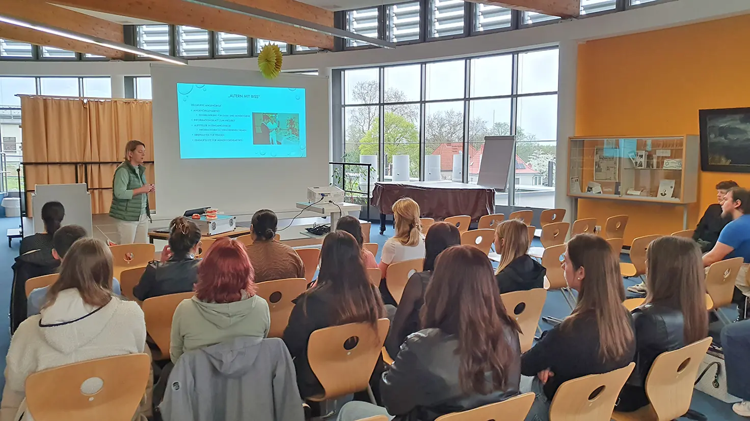 Im Projekt „AzuBiss“, das die ZÄK jährlich an und mit der Berufsbildenden Schule „Otto Schlein“ in Magdeburg veranstaltet, rücken die Älteren in den Fokus der Prävention, denn das Projekt will Wissen und Verständnis um die Bedeutung der Mundgesundheit von Seniorinnen und Senioren wecken. Auszubildende der Berufe Pflegefachkraft und Zahnmedizinische Fachangestellte erhalten im Rahmen der Projekttage Einblicke in die Veränderungen des menschlichen Körpers im Alter, den damit einhergehenden Krankheiten und Anforderungen für die Zahnhygiene sowie den zur Verfügung stehenden Hilfsmitteln. Neben Vorträgen und Wissensvermittlung können die Azubis in Arbeitsgruppen aus ZFA und Pflegefachkräften in Stationsarbeit praktische Erfahrungen sammeln. Für viele Aha-Erlebnisse sorgt dabei der Altersanzug „Gert“ der ZÄK, dank dessen einengenden Schienen und Gewichten die Azubis im Handumdrehen um etliche Jahrzehnte altern und so am eigenen Leib die Einschränkungen und das Erleben von Senioren, gerade wenn es um die eigene Mundhygiene geht, nachvollziehen können. Zu „Gerts“ Möglichkeiten gehören auch eine Brille, die die Sehkraft einschränkt, sowie Handschuhe, die zittrige Hände simulieren. Organisiert wird der gemeinsame Projekttag „AzuBiss“ von Schule und Zahnärztekammer bereits seit 2013. In der aktuellen Form ist er seit 2018 fester Bestandteil der Ausbildung von Pflegekräften und ZFA an der BBS „Otto Schlein“.
