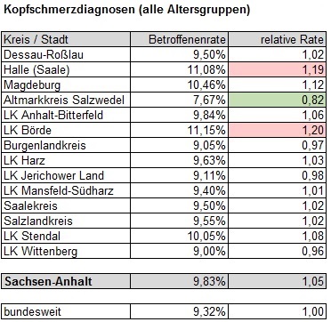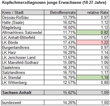 Regionale Unterschiede der Kopfschmerzdiagnosen in Sachsen-Anhalt (prozentual und in Relation zum Bundesdurchschnitt): über alle Altersgruppen hinweg (links) und bei jungen Erwachsenen (rechts).